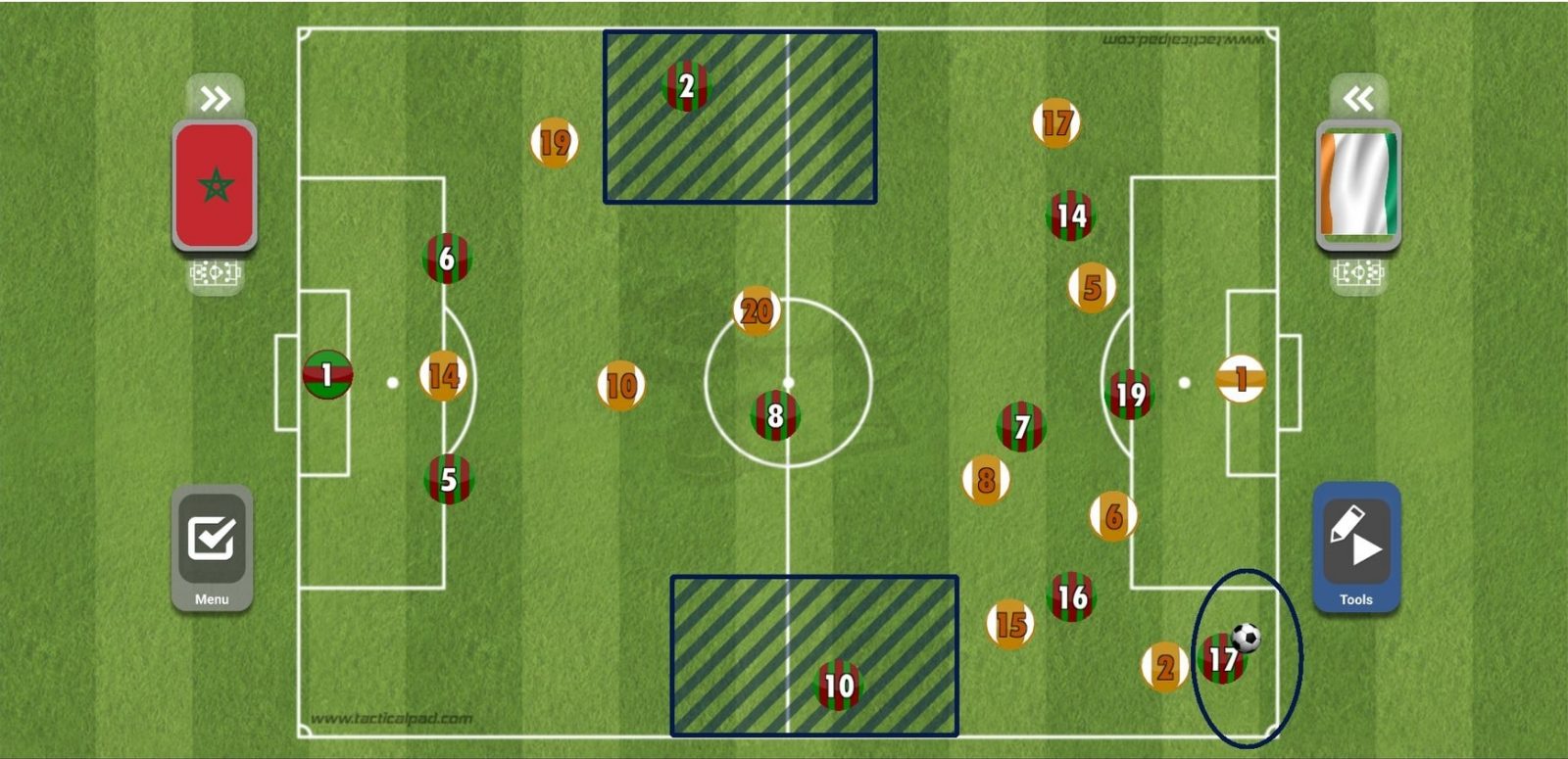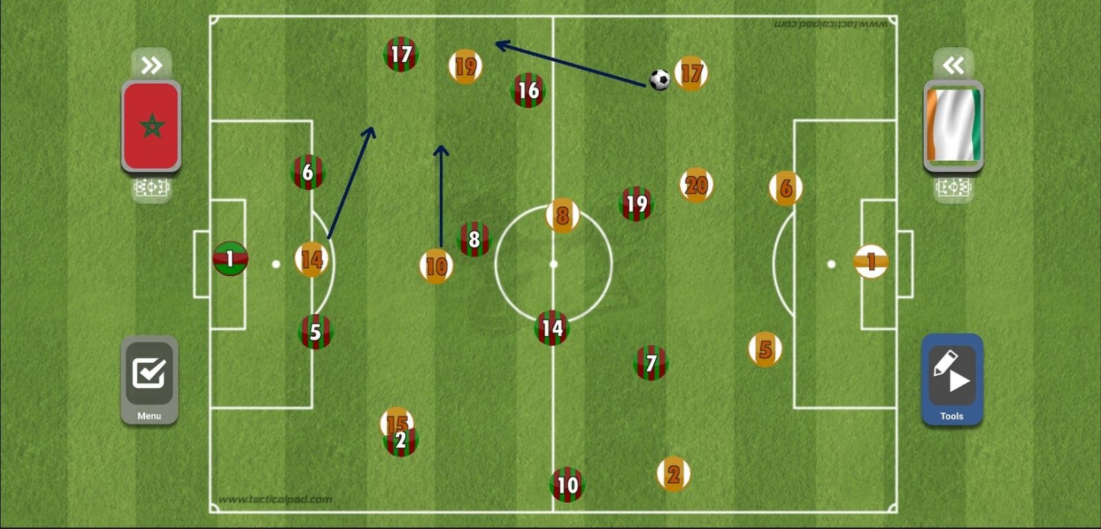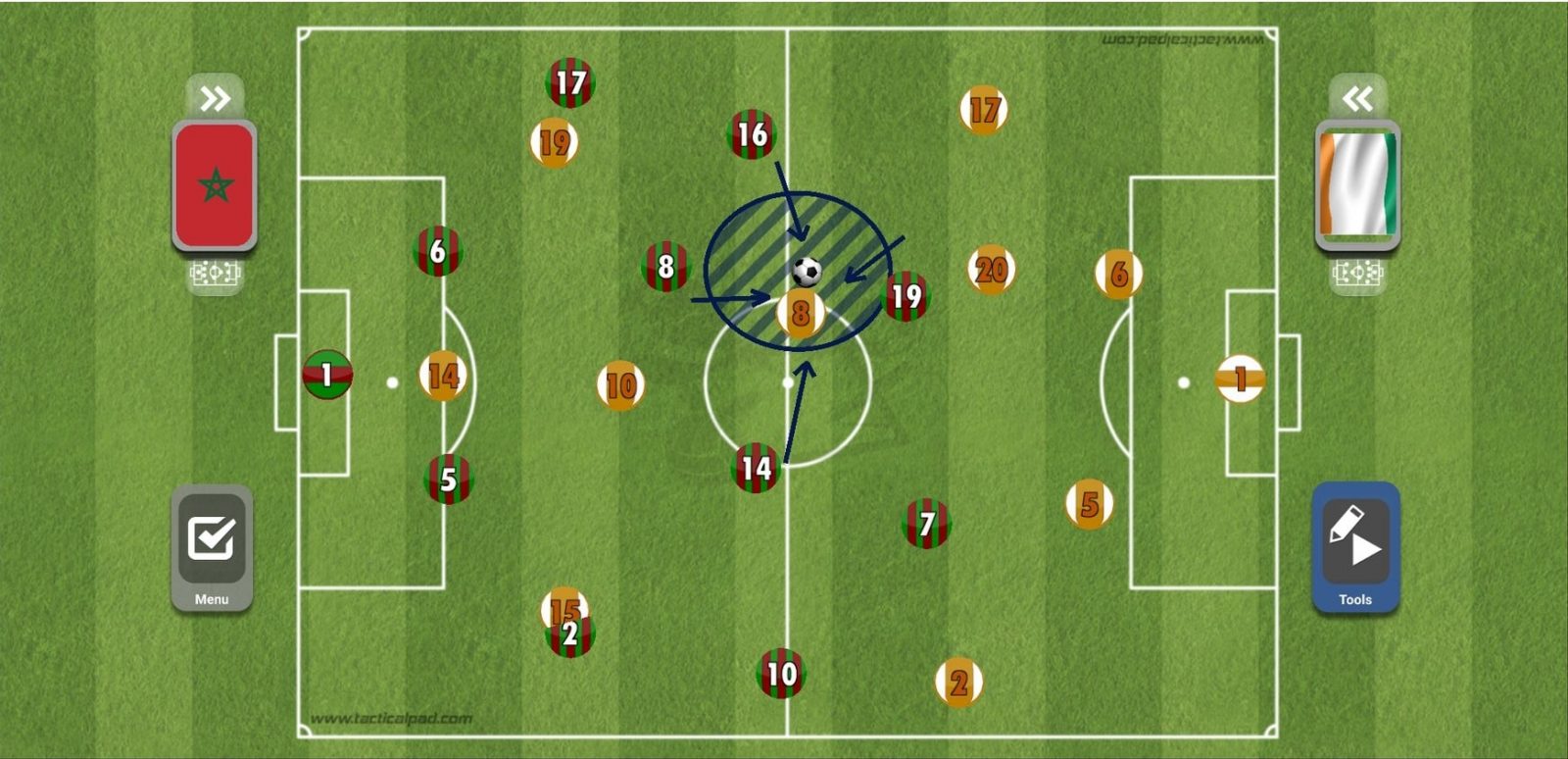المنتخب الغربي يكثف ضغطه عندما تحاول كوت ديفوار اختراق وسط ملعب أسود الأطلس، وحينها يقوم أكثر من ثلاثة لاعبين بالضغط على الكرة مرة واحدة ومن ثم افتكاكها مرة واحدة.
