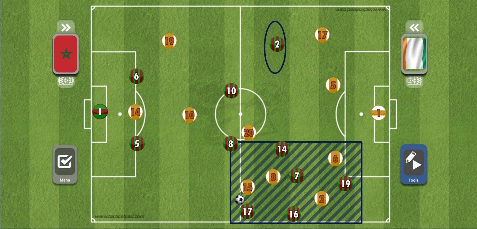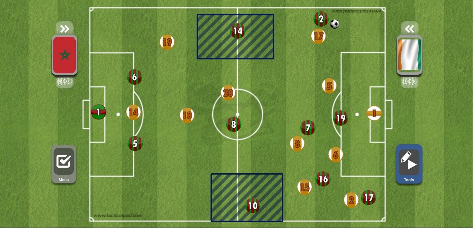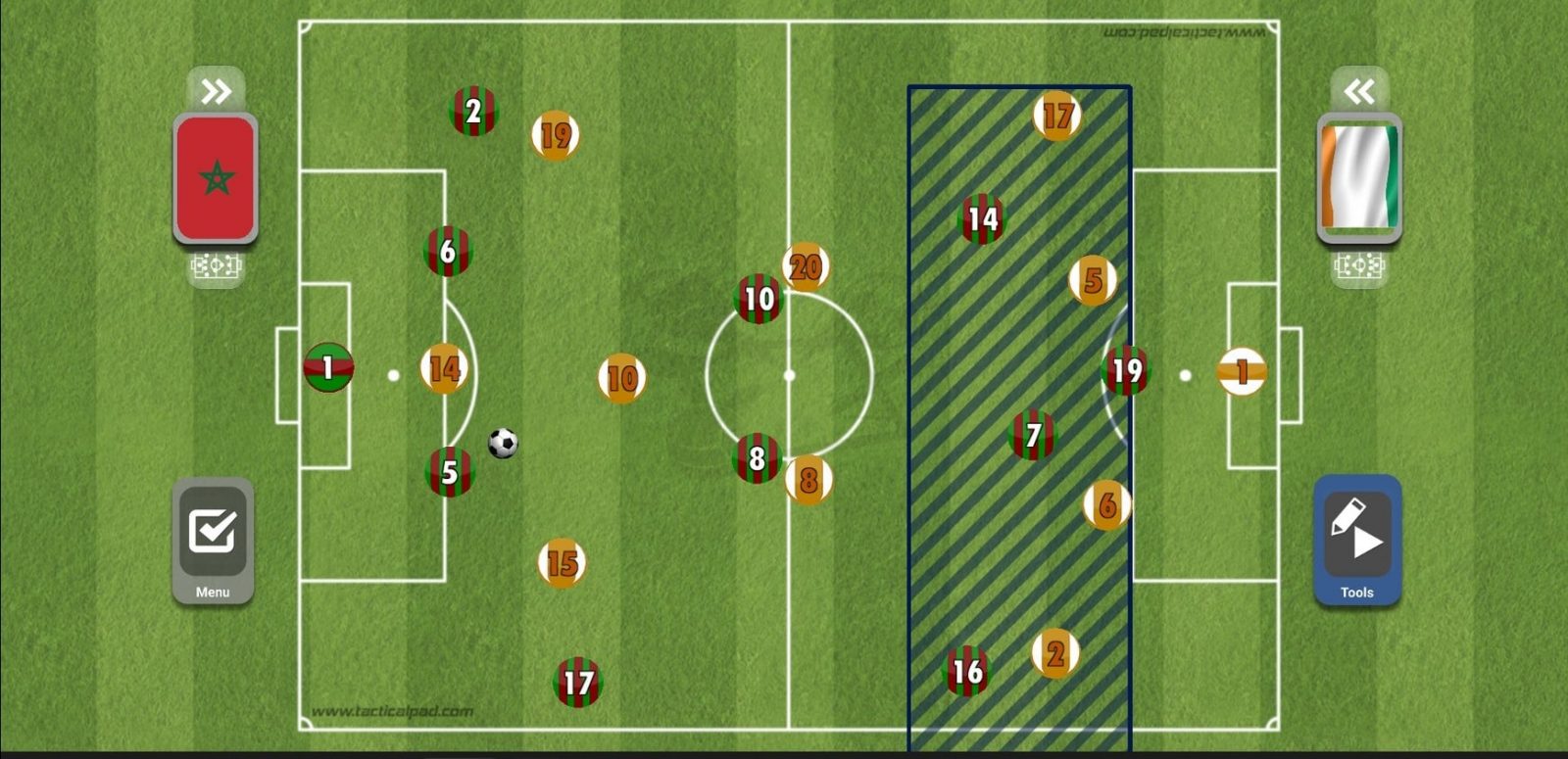 المنتخب الغربي يكثف ضغطه عندما تحاول كوت ديفوار اختراق وسط ملعب أسود الأطلس، وحينها يقوم أكثر من ثلاثة لاعبين بالضغط على الكرة مرة واحدة ومن ثم افتكاكها مرة واحدة.
