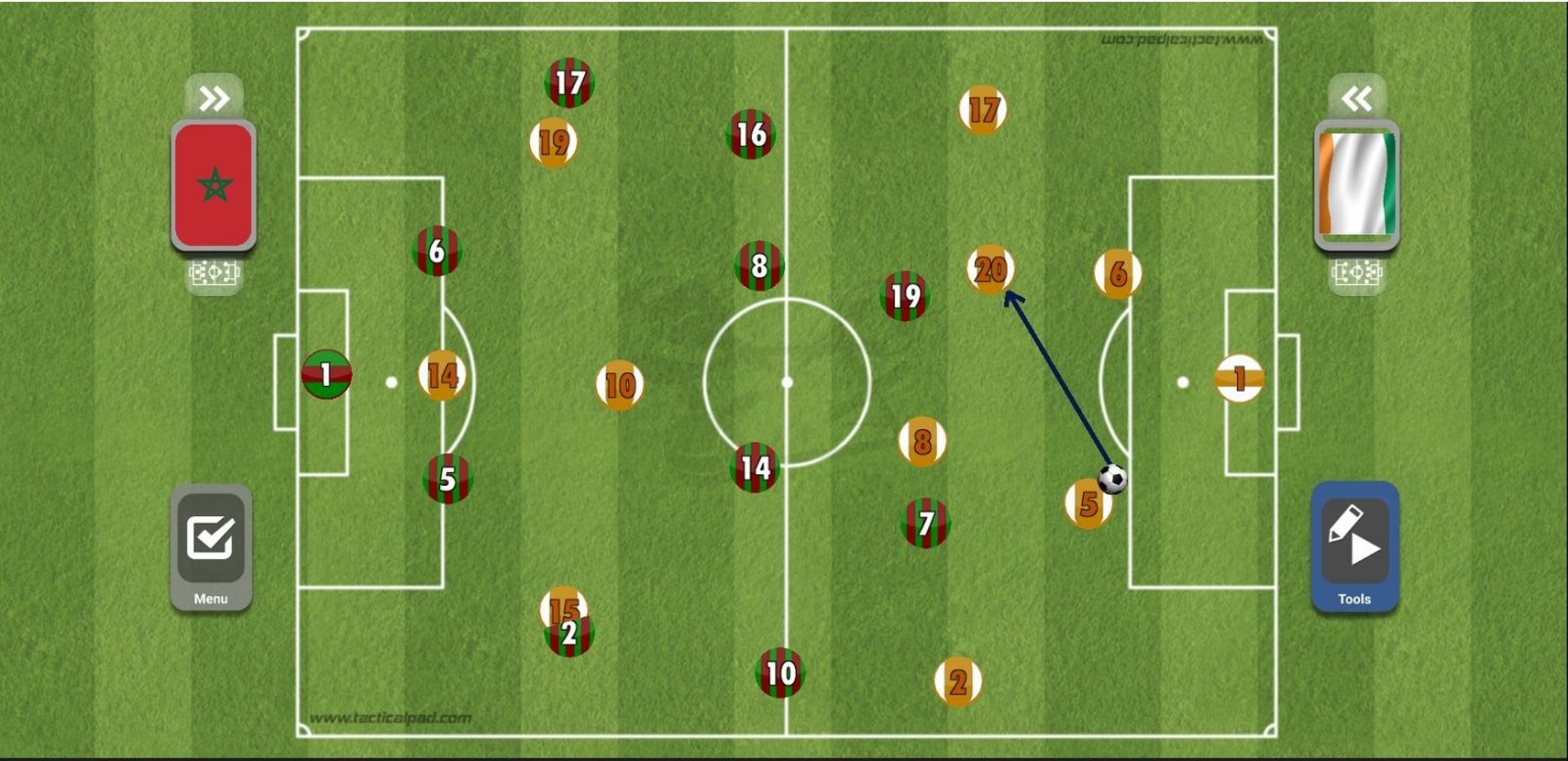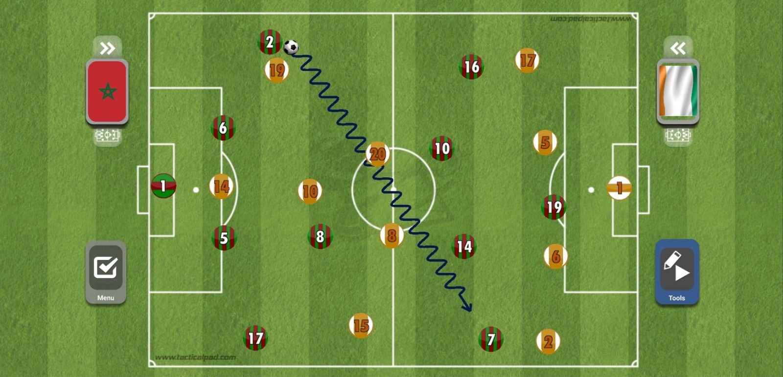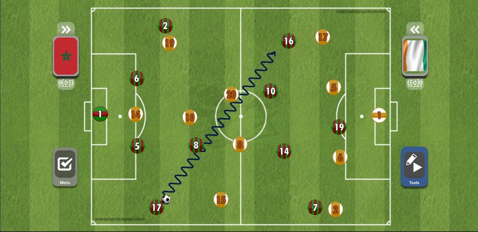 كان للمنتخب المغربي بعض اللعب المباشر من خلال التمريرات القطرية، ولكن في أغلب حدوث تلك الحالة كان يلتزم نور الدين مرابط وحكيم زياش بمكانهما.