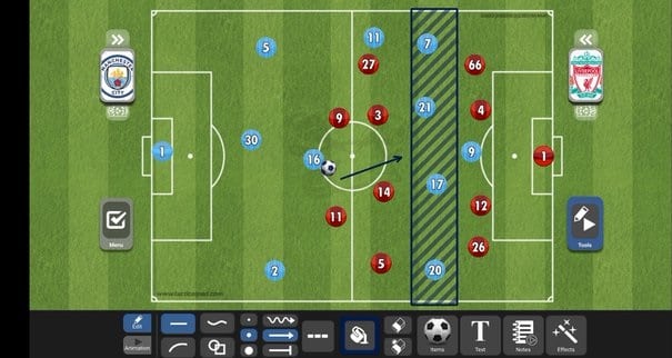 المساحة خلف روبيرتسون، الظهير الأيسر للريدز، شكلت عائق كبير بالنسبة لليفربول، حيث إنه عندما كان يستلم بيرناردو سيلفا الكرة على الخط يتحرك تلقائيا دي بروين في المساحة خلفه خلال أنصاف المساحات (المساحة المتواجدة بين الظهير وقلب الدفاع) وفي مباراة اليوم كانت هذه السماحة متواجدة بين فان دايك، قلب دفاع ليفربول، وربويرتسون.