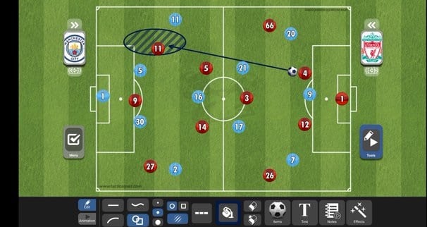 المساحة خلف روبيرتسون، الظهير الأيسر للريدز، شكلت عائق كبير بالنسبة لليفربول، حيث إنه عندما كان يستلم بيرناردو سيلفا الكرة على الخط يتحرك تلقائيا دي بروين في المساحة خلفه خلال أنصاف المساحات (المساحة المتواجدة بين الظهير وقلب الدفاع) وفي مباراة اليوم كانت هذه السماحة متواجدة بين فان دايك، قلب دفاع ليفربول، وربويرتسون.