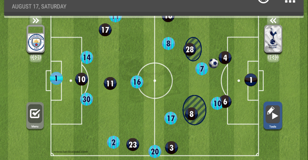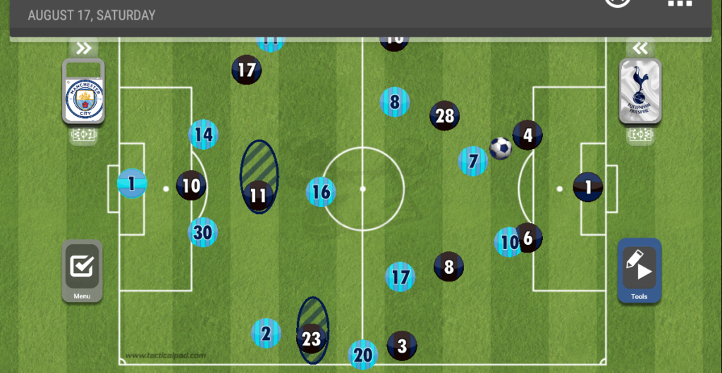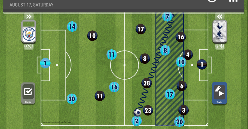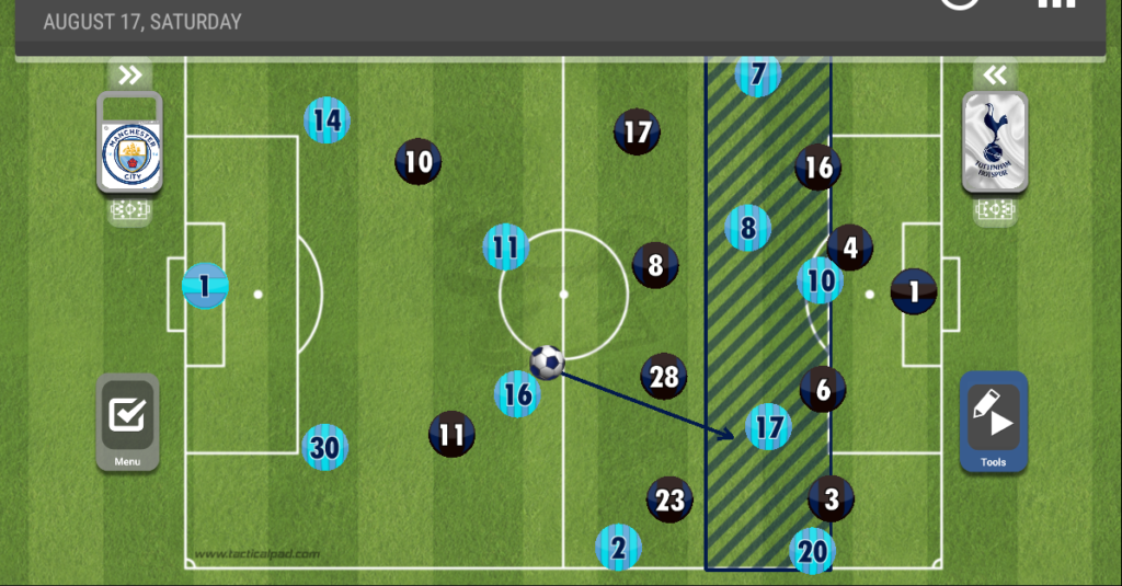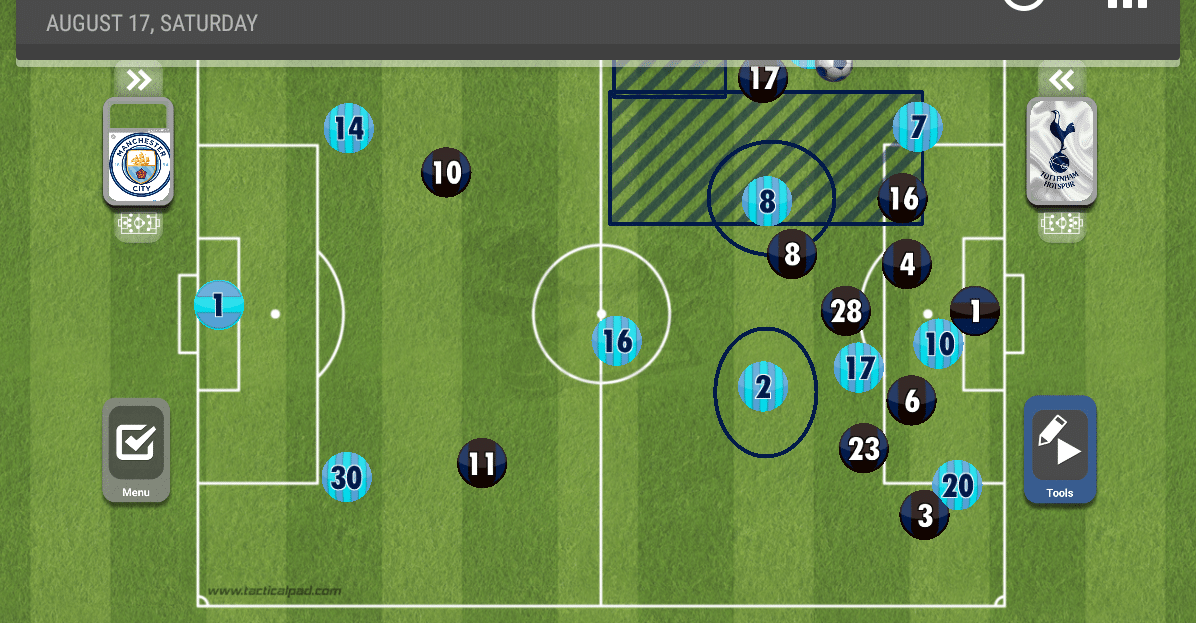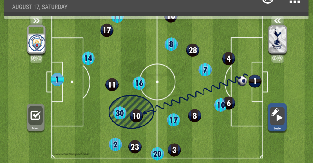 الطريقة التي كان يلجأ إليها توتنهام هو الكرة العالية لهاري كين واستخدامه كمحطة، رافق أوتامندي كين في الألعاب الهوائية أينما ذهب، ولاعب مانشستر سيتي نجح في ذلك بشكل كبير.