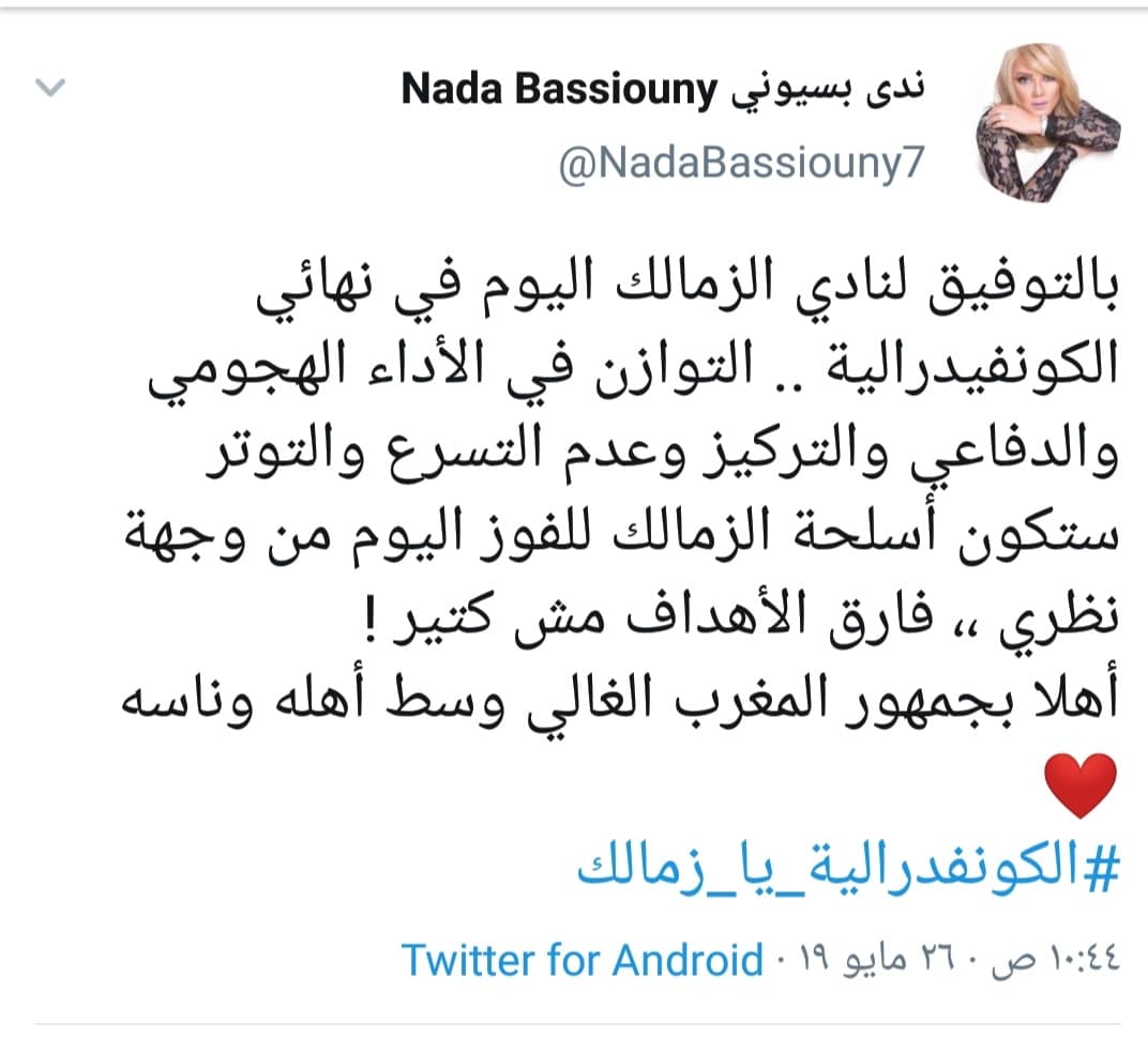 أما الفنانة ندي بسيوني غردت: “بالتوفيق لنادي الزمالك اليوم في نهائي الكونفيدرالية، التوازن في الأداء الهجومي والدفاعي والتركيز وعدم التسرع والتوتر ستكون أسلحة الزمالك للفوز اليوم من وجهة نظري ،، فارق الأهداف مش كتير !أهلا بجمهور المغرب الغالي وسط أهله وناسه”.