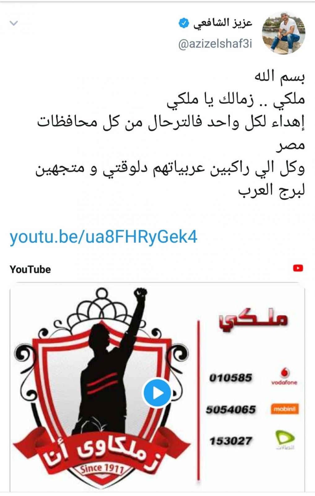 غرد الملحن الزملكاوي عزيز الشافعي على صفحته بموقع التواصل الاجتماعي “تويتر” مخاطبًا الجماهير البيضاء: “بسم الله ملكي..زمالك ياملكي، إهداء لكل واحد فالترحال من كل محافظات مصر، وكل اللي راكبين عربياتهم دلوقت ومتجهين لبرج العرب”.