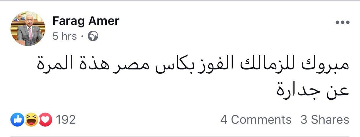 وكتب عامر على حسابه الشخصي بأحد مواقع التواصل الإجتماعي الفيسبوك: “مبروك لفوز الزمالك بكأس مصر هذه المرة عن جدارة”.