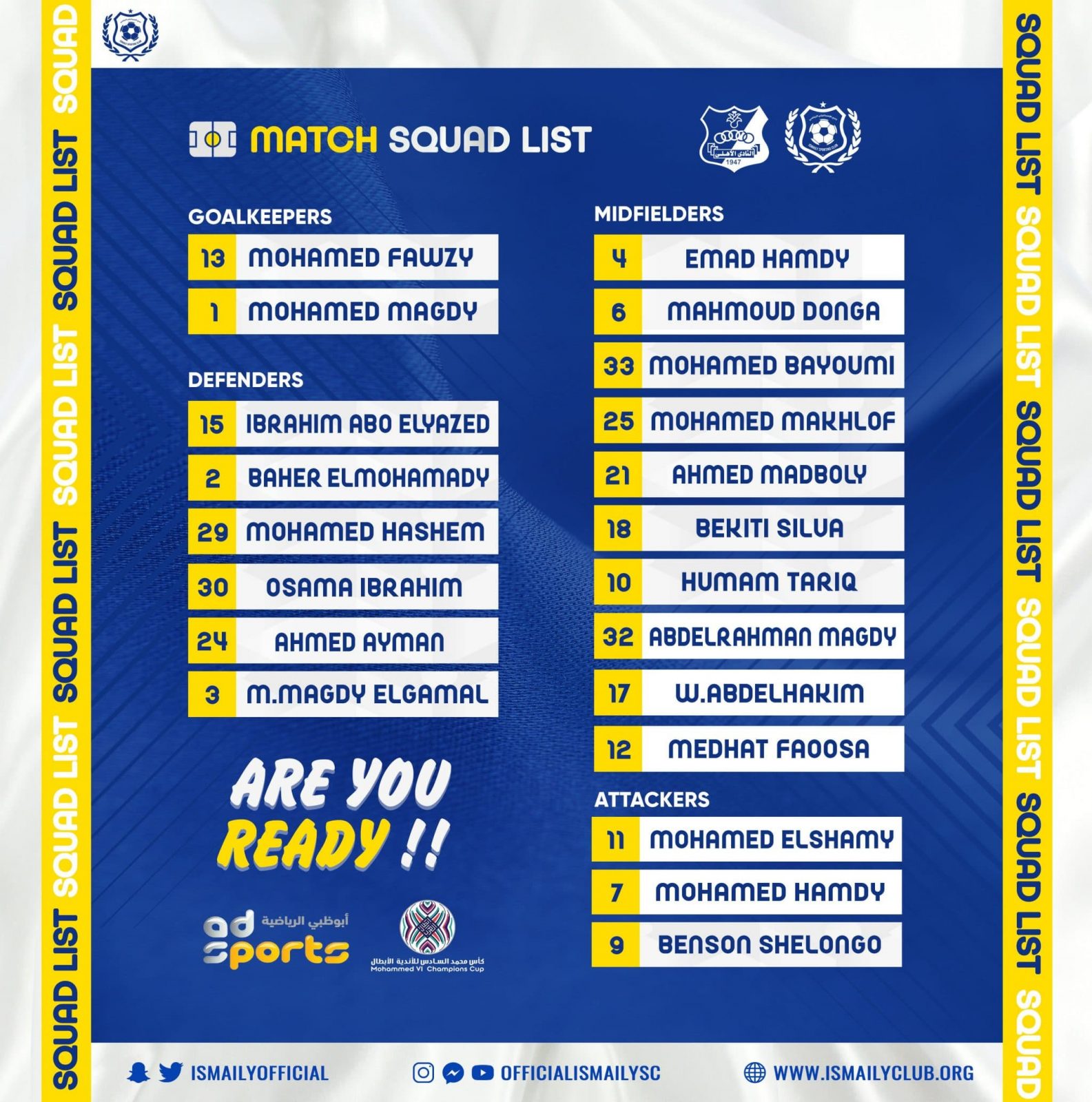 أعلن الصربى ميودراج ييسيتش المدير الفنى للإسماعيلى قائمة الفريق التي سيواجهة بها نظيره أهلى بنغازى ضمن منافسات ذهاب دور الــ32 من بطولة كأس محمد السادس للأندية الأبطال.