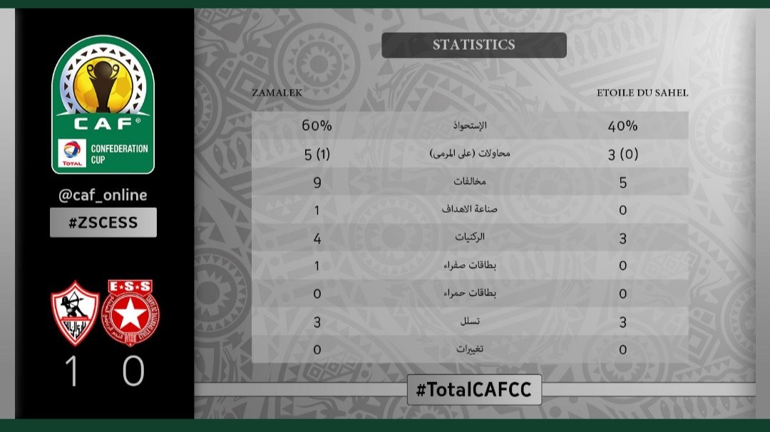ونشر حساب الاتحاد الإفريقي لكرة القدم “كاف” عبر حسابه الرسمي على موقع التغريدات القصيرة”تويتر”، إحصائيات الشوط الأول من المباراة التي تقام الآن، وجاءت كالتالي: