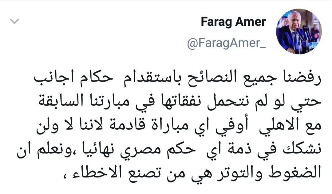 وقال عامر عبر حسابه بموقع التواصل الإجتماعي “تويتر”: “رفضنا جميع النصائح باستقدام حكام أجانب حتي لو لم نتحمل نفقاتها في مبارتنا السابقة مع الاهلي، أو في أي مباراة قادمة لأننا لا ولن نشكك في ذمة أي حكم مصري نهائيا ،ونعلم أن الضغوط والتوتر هي من تصنع الأخطاء”.