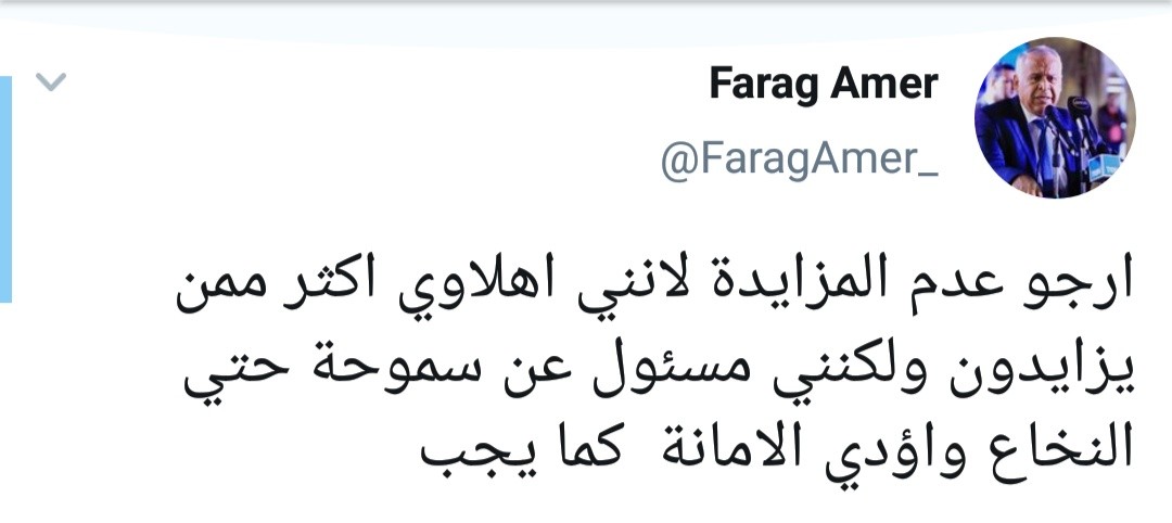 وأتم تغريداته: “ارجو ان يتوقف من يزايدون لاننا نعرف الاهلي ونحترمة اكثر منهم و لم نخطئ في حقة لكننا ندافع عن الحق وعن العدالة الرياضية ولا نقبل ان يكون سموحة الضحية”.