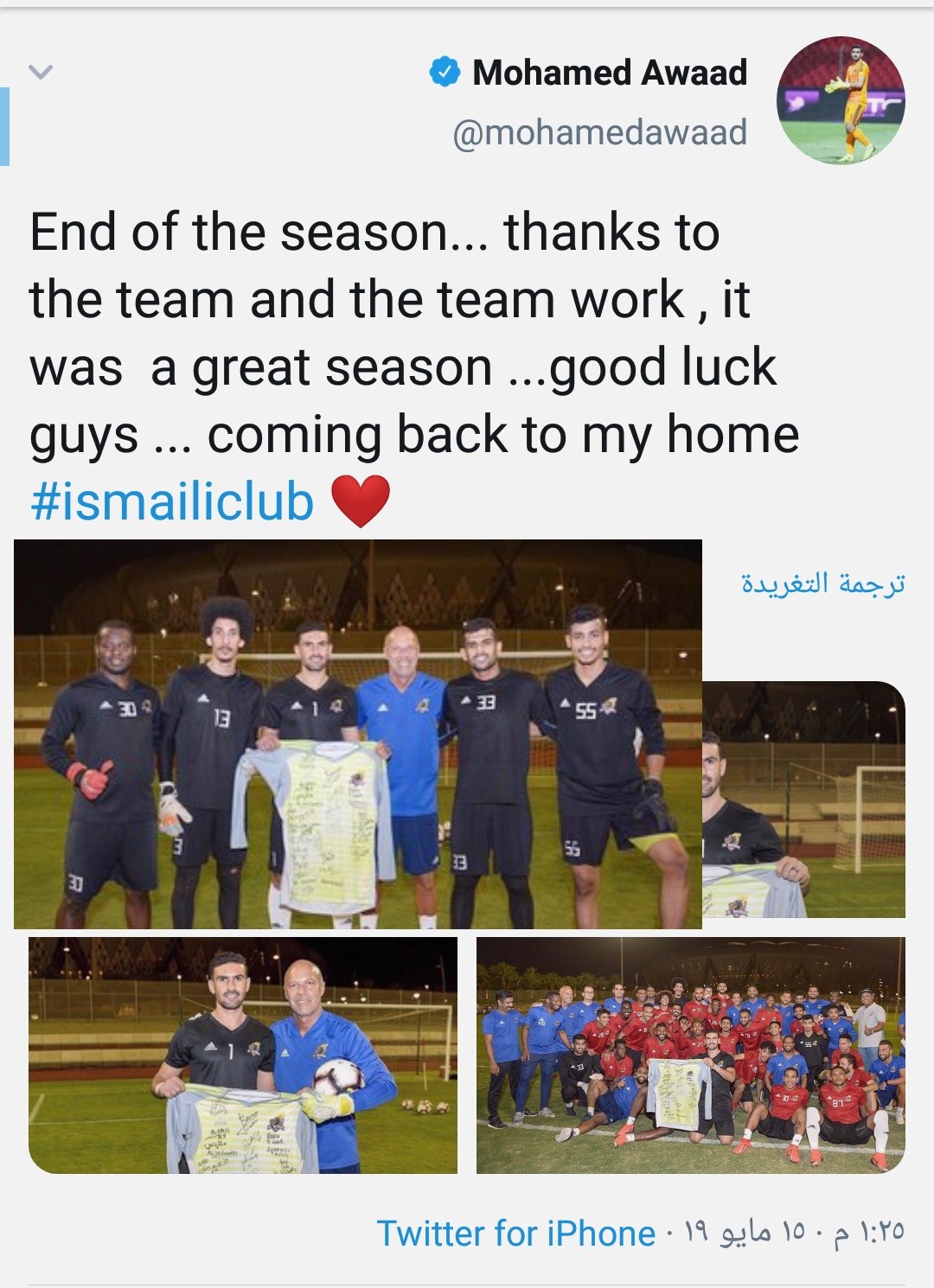 وكتب عواد عبر حسابه الرسمي على موقع التواصل الاجتماعي للتدوينات القصيرة “تويتر”: “نهاية الموسم، بفضل الفريق وللعمل الجماعي، فقد كان موسمًا رائعًا، حظًا سعيدًا يا شباب”.