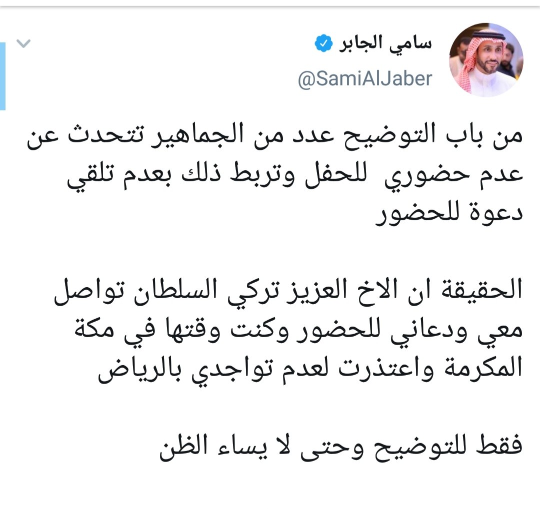 وقال الجابر في تغريدة على حسابه الشخصي بمواقع التواصل “تويتر”: “من باب التوضيح عدد من الجماهير يتحدث عن عدم حضوري للحفل وتربط ذلك بعدم تلقي دعوة للحضور.. الحقيقة أن الأخ العزيز تركي السلطان تواصل معي ودعاني للحضور وكنت وقتها في مكة المكرمة واعتذرت لعدم تواجدي بالرياض.. فقط للتوضيح وحتى لا يساء الظن”.