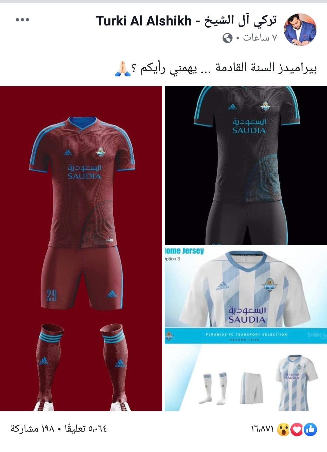 ونشر آل الشيخ على مواقع التواصل الإجتماعي عبر حسابه الخاص “فيس بوك “: صور قميص نادي بيراميدز الأساسي والإحتياطي والثالث” قائلاً بيراميدز السنة القادمة، يهمني رأيكم ؟