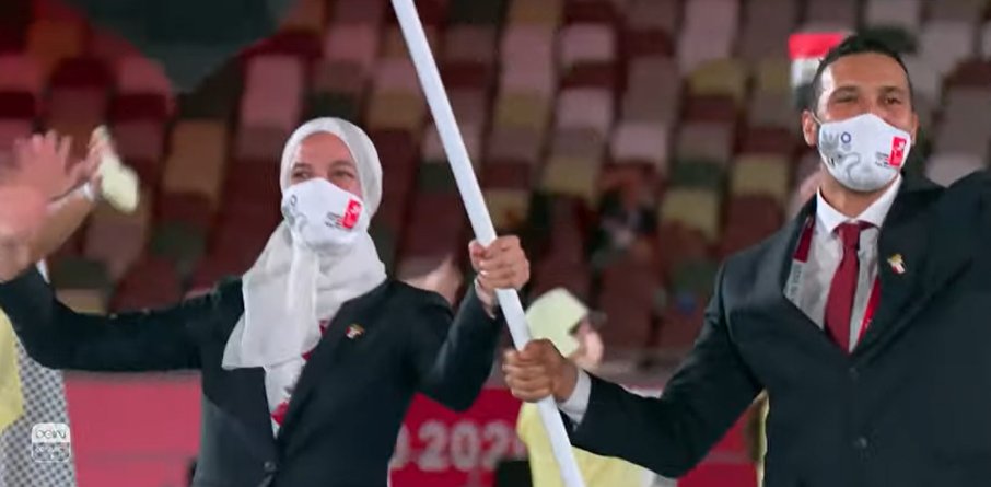 رفع الثنائي هداية ملاك وعلاء أبو القاسم علم مصر أثناء دخول طابور عرض أولمبياد طوكيو رفقة بعثة الفراعنة ضمن البعثات المشاركة في حفل افتتاح الأولمبياد والمقامة حاليًا في اليابان.
