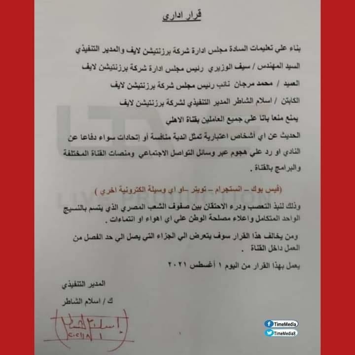 فقد تقرر منع جميع العاملين بقناة النادي الأهلي من الحديث عن أي أشخاص اعتبارية تمثل أندية منافسة أو اتحادات سواء دفاعًا عن النادي أو رد على هجوم عبر وسائل التواصل الاجتماعي ومنصات القناة المختلفة والبرامج بالقناة.