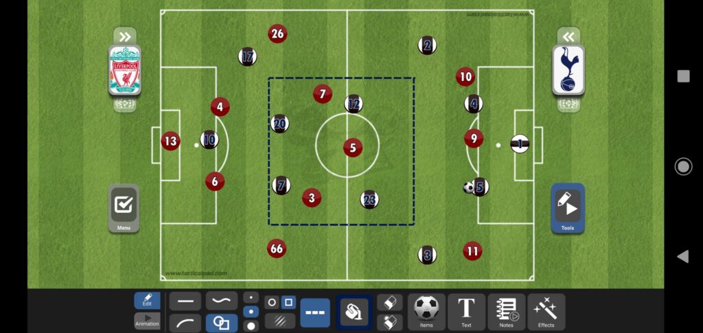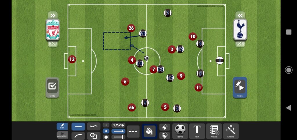 عندما لا يدخل أحد الأجنحة إلى عمق الملعب يتواجد ديلي ألي كصانع ألعاب بين خطوط المنافس والتي ستكون اليوم بين خط وسط ليفربول والخط الخلفي، ويتواجد أريكسن كلاعب محوري ويكون على الدائرة كما شرحنا في السطور السابقة.