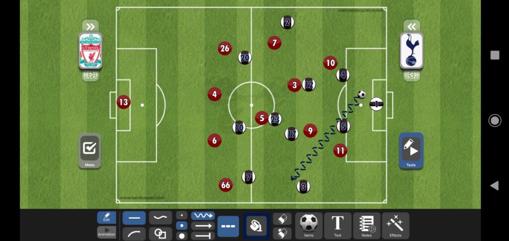 أول أفكار خروج مدرب توتنهام بالكرة ستكون من خلال ظيهري السبيرز سواء من الجانب الأيمن أو الأيسر، فكلوب يعمل بشتى الطرق على منع المنافس من التوغل لعمق الملعب.