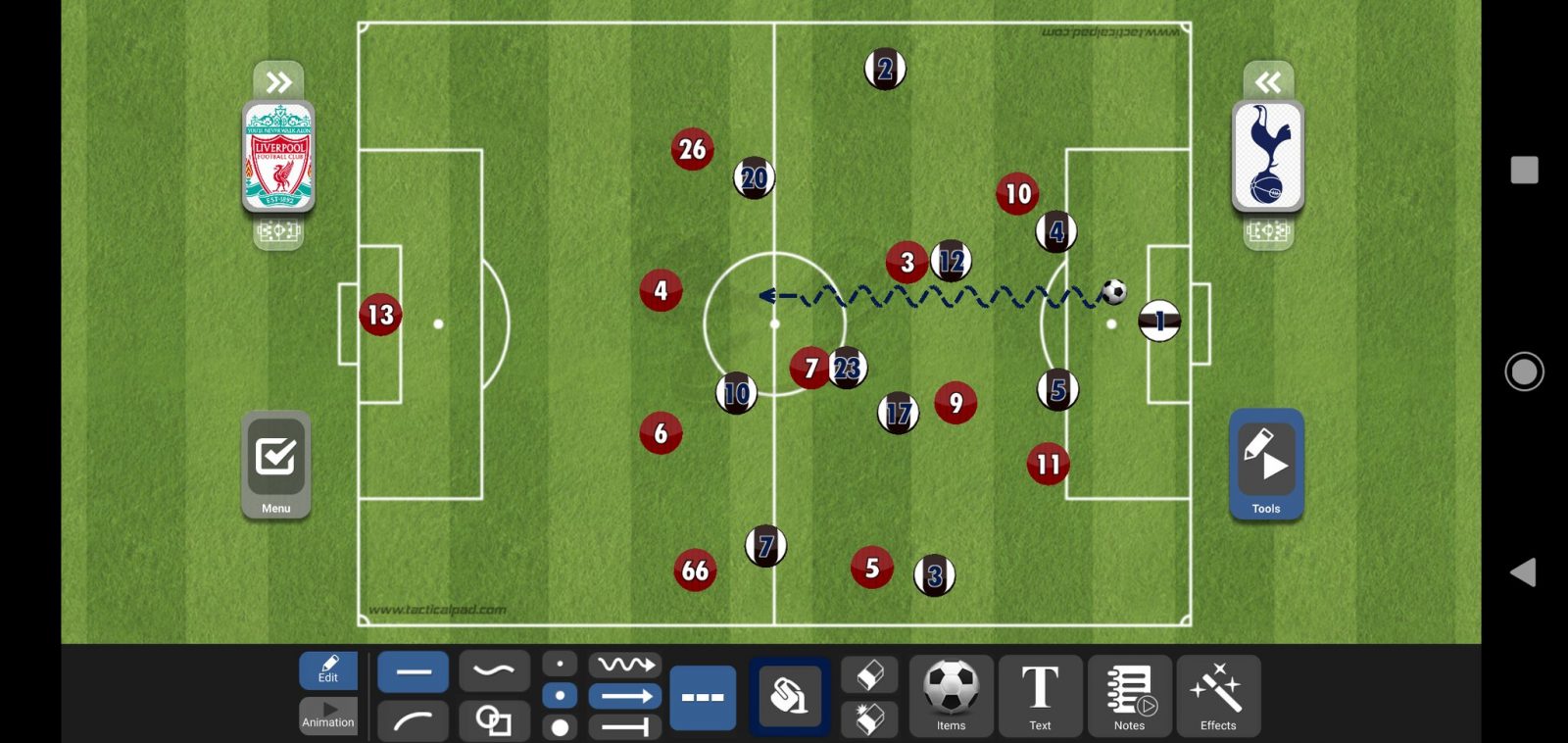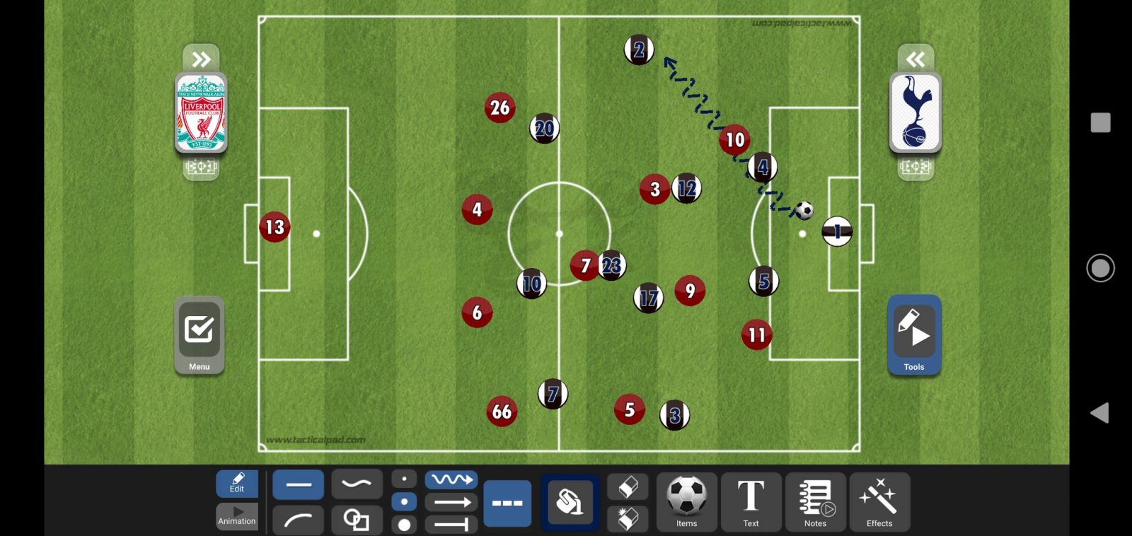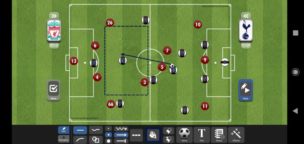 عندما لا يدخل أحد الأجنحة إلى عمق الملعب يتواجد ديلي ألي كصانع ألعاب بين خطوط المنافس والتي ستكون اليوم بين خط وسط ليفربول والخط الخلفي، ويتواجد أريكسن كلاعب محوري ويكون على الدائرة كما شرحنا في السطور السابقة.