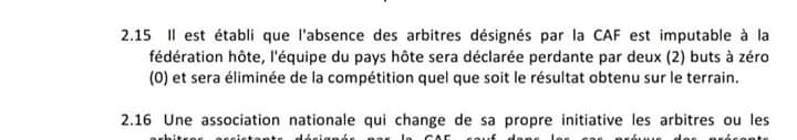 وتنص المادة 2/15 على أنه في حالة عدم حضور حكام المباراة فإن الفريق المستضيف يخسر بهدفين لصفر.