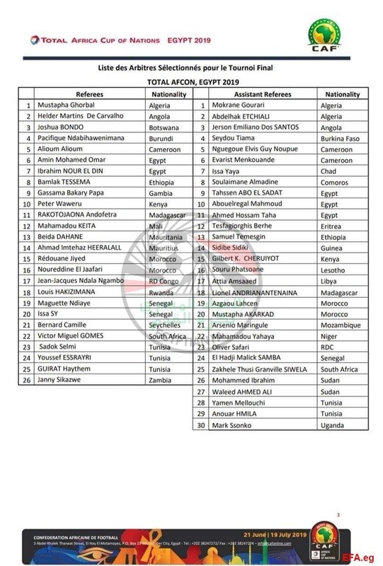 وكشف “كاف” عن قائمة حكام الساحة والمساعدين في “كان 2019″، وشهدت القائمة تواجد الثنائي المصري أمين عمر وإبراهيم نور الدين ساحة، وثلاثة حكام مساعدين هم، تحسين أبو السادات، ومحمود أبو الرجال، وأحمد حسام طه، وتم استبعاد جهاد جريشة الذي تواجد في القائمة المبدئية بعد قرار إيقافه لمدة 6 شهور من قبل “الكاف” بداعي سوء المستوى في مباراة ذهاب نهائي دوري أبطال أفريقيا بين والوداد المغربي والترجي التونسي.