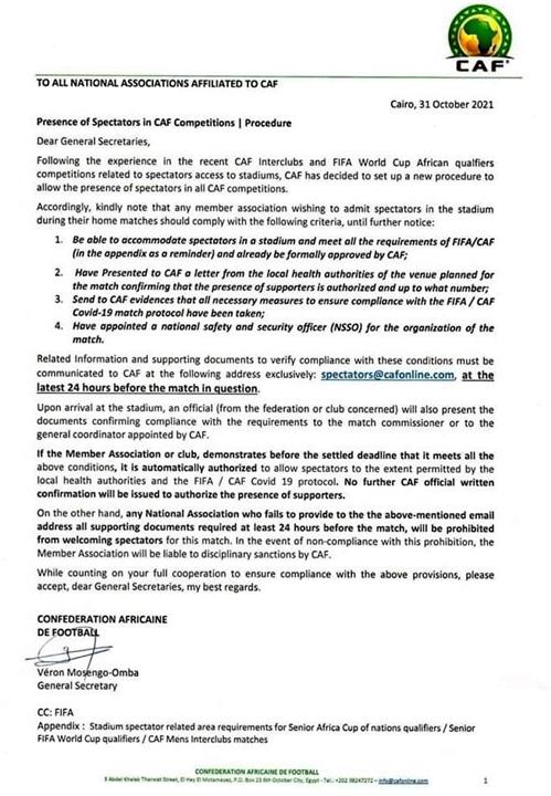 وأرسل الاتحاد الأفريقي خطابات رسمية، لجميع الاتحادات يتضمن شروط حضور الجماهير في مباريات دوري أبطال أفريقيا والكونفدرالية، كامل العدد في المدرجات.