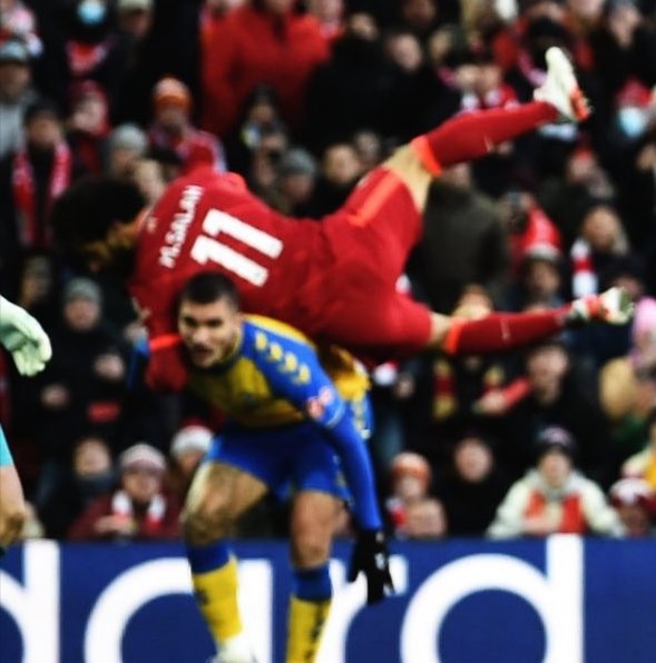 وشهدت المباراة لقطة طريفة لمحمد صلاح داخل منطقة الجزاء، بعدما حاول مدافع ساوثهامبتون إيقاف خطورته، حيث قام بدفعه ليعتلي الفرعون المصري ظهره في الوضع طائرًا.