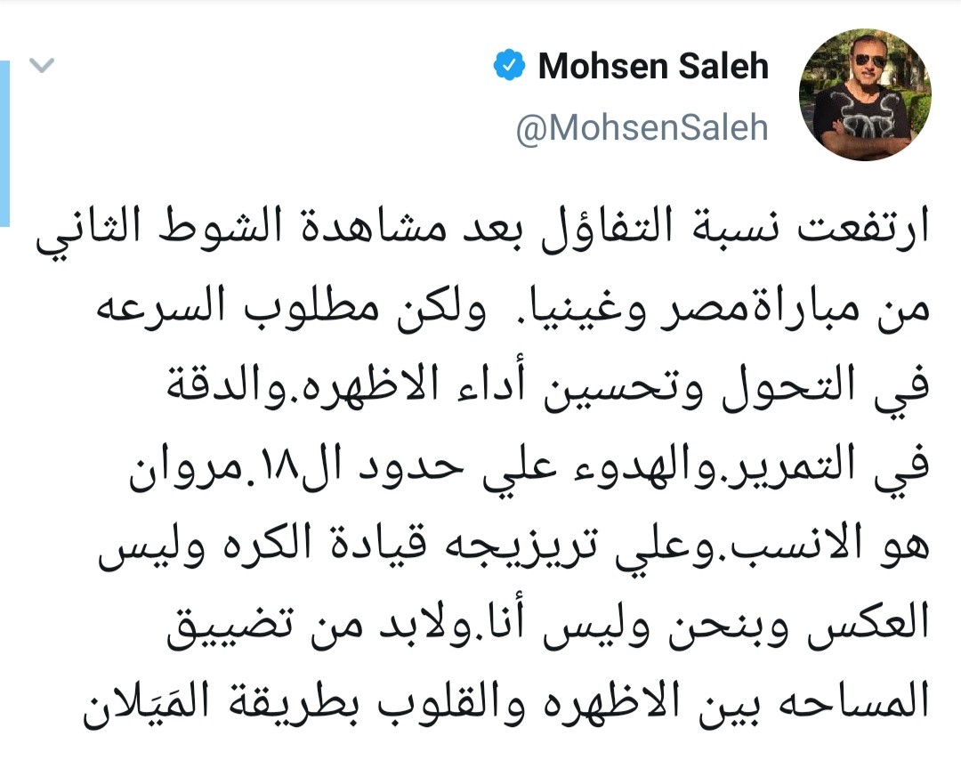وكتب نجم مصر على حسابه الشخصي عبر موقع التواصل الاجتماعي “تويتر”: “ارتفعت نسبة التفاؤل بعد مشاهدة الشوط الثاني في مباراة مصر وغينيا”.
