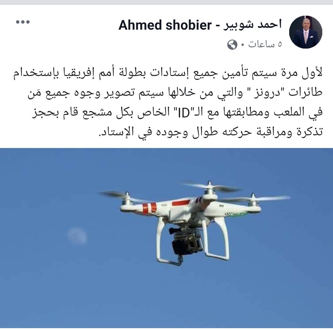 وقال شوبير على حسابه الرسمي بموقع التواصل الاجتماعي “فيس بوك”: “لأول مرة سيتم تأمين جميع استادات بطولة أمم إفريقيا باستخدام طائرات –درونز-“.