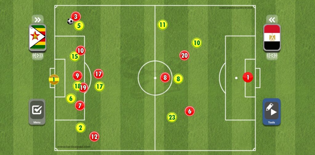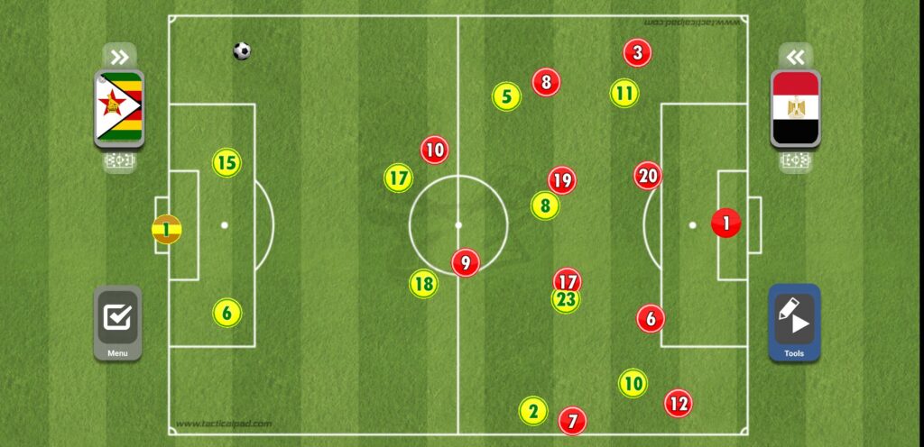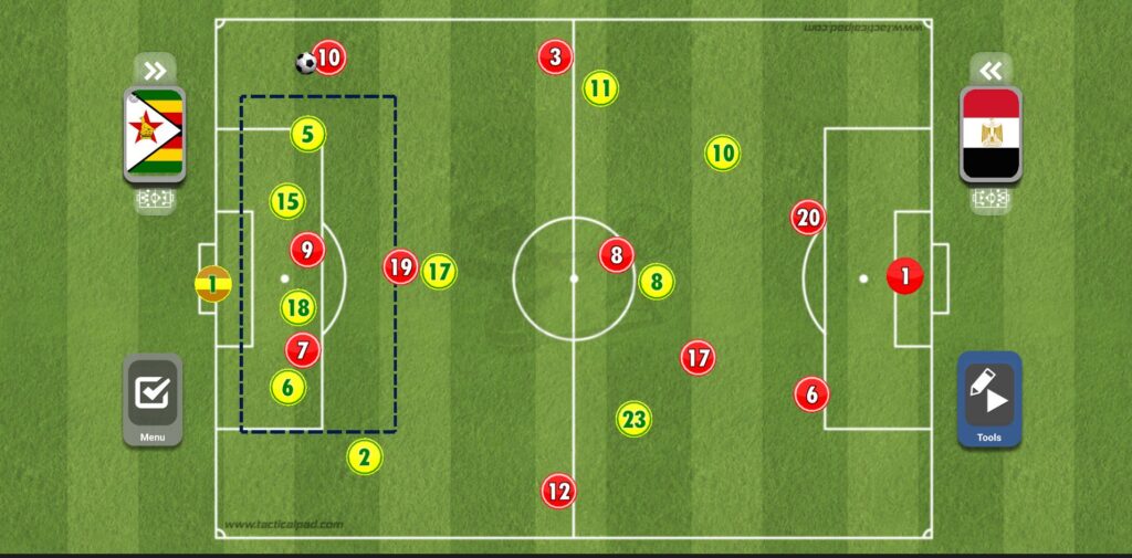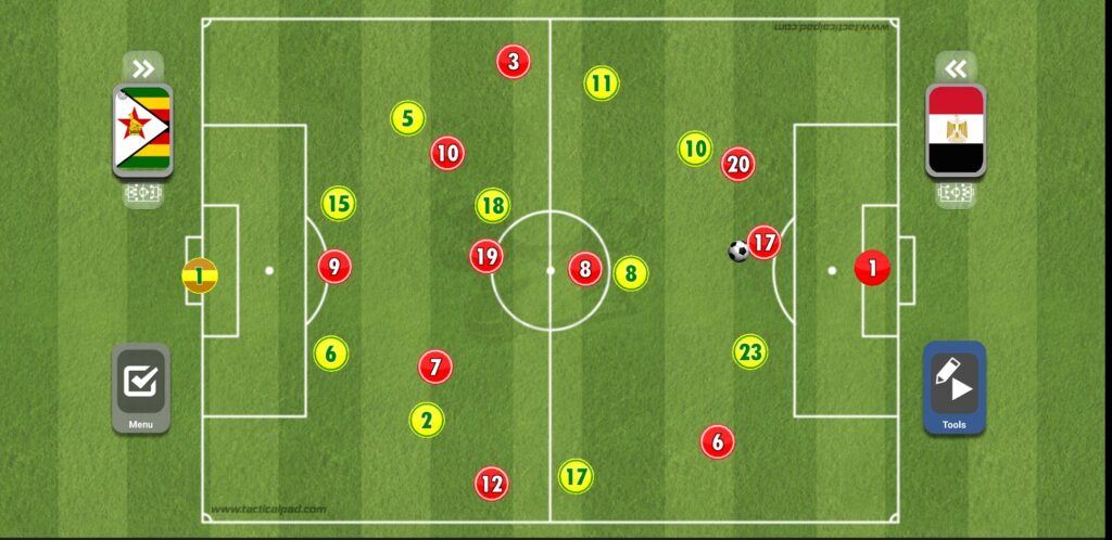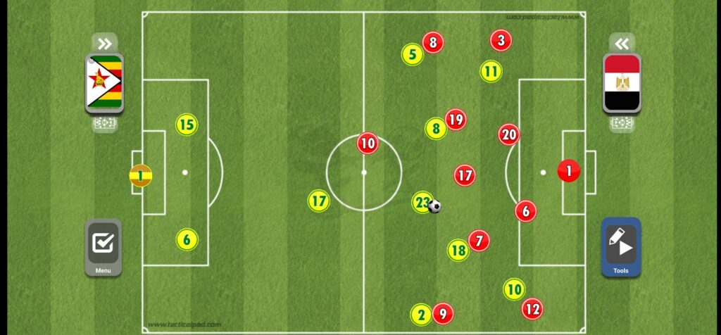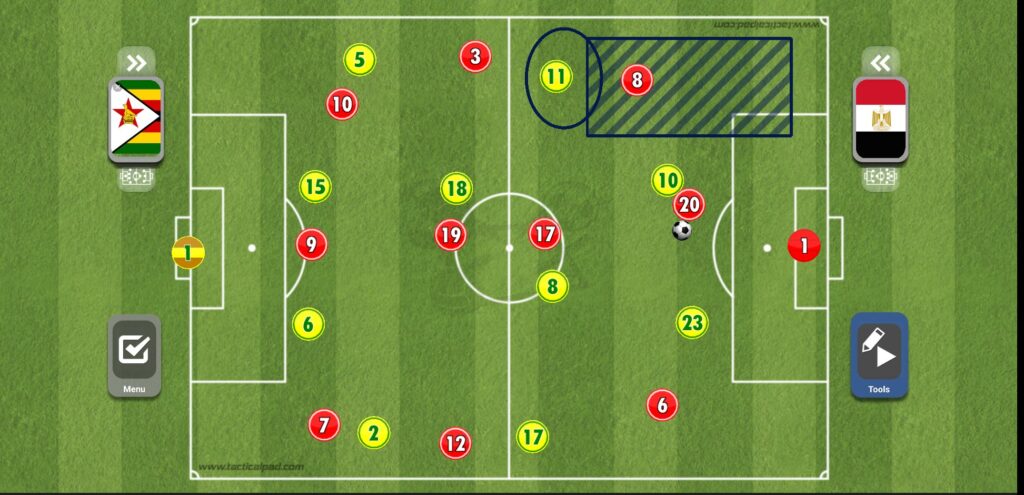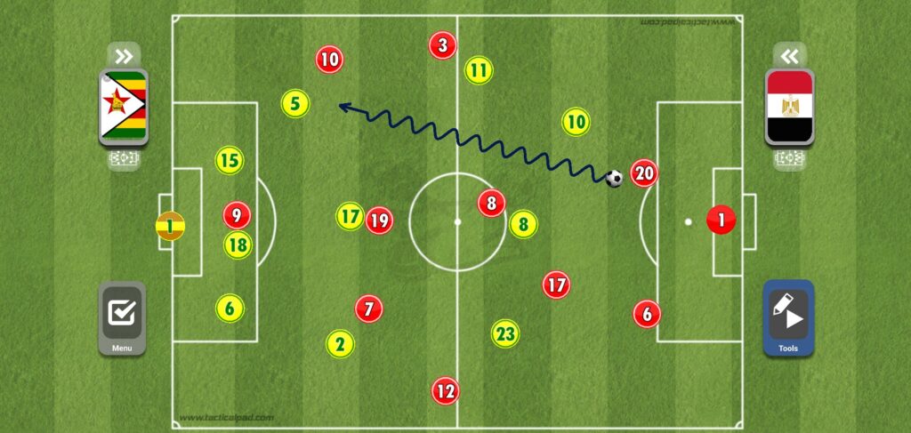 عند قيام أحد الأظهرة بالعرضية بعد الطريقة التي ذكرناها، يقوم كل من صلاح وتريزيجه وعبد الله السعيد بالقيام بالمساندة الهجومية داخل منطقة الجزاء، مع وجود محمد النني على حدود المنطقة للتسديد، ولكن العيب الأكبر هنا هو وجود ثلاثي فقط في المنطقة الدفاعية لمنتخب مصر مقابل أربعة أفراد من زيمبابوي، الأمر الذي كاد أن يسبب للفراعنة الكثير من المشاكل.