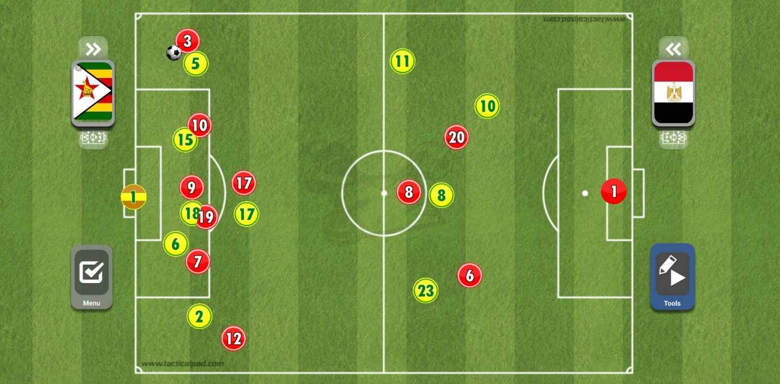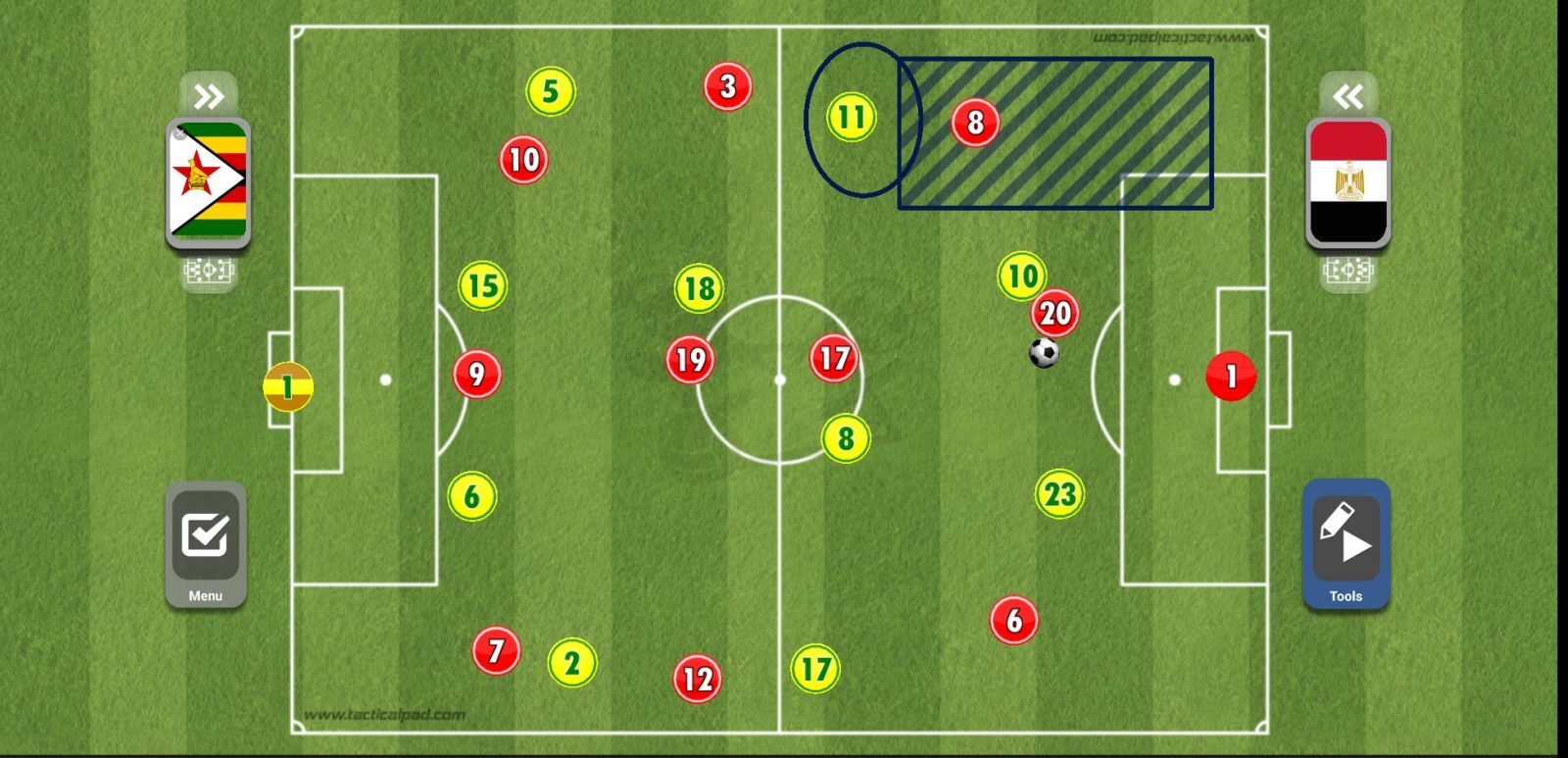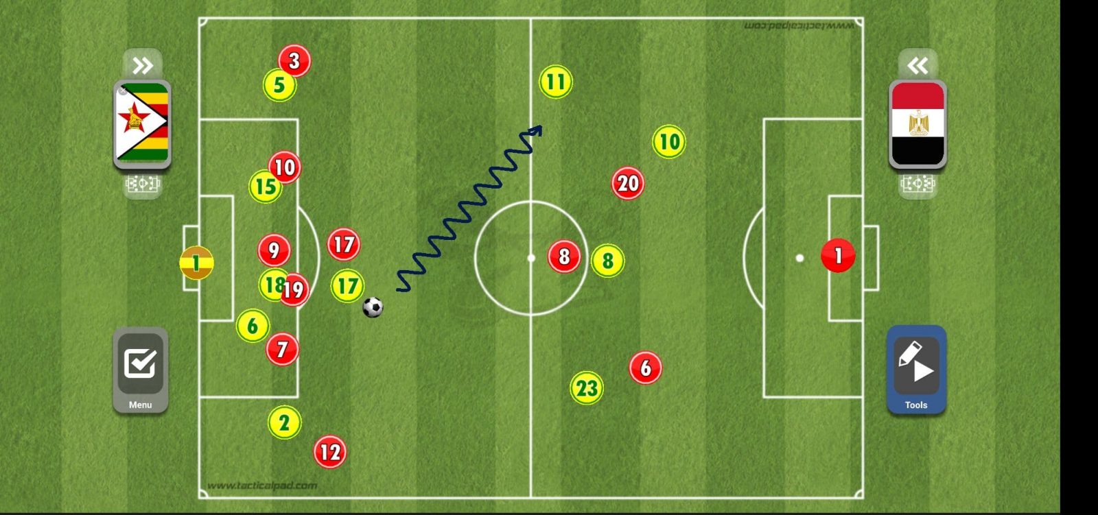 ويحاول لاعبو المنتخب المصري بعدها أن يضعوا أحد الأظهرة في موقف مثالي لإرسال العرضية داخل منطقة الجزاء.