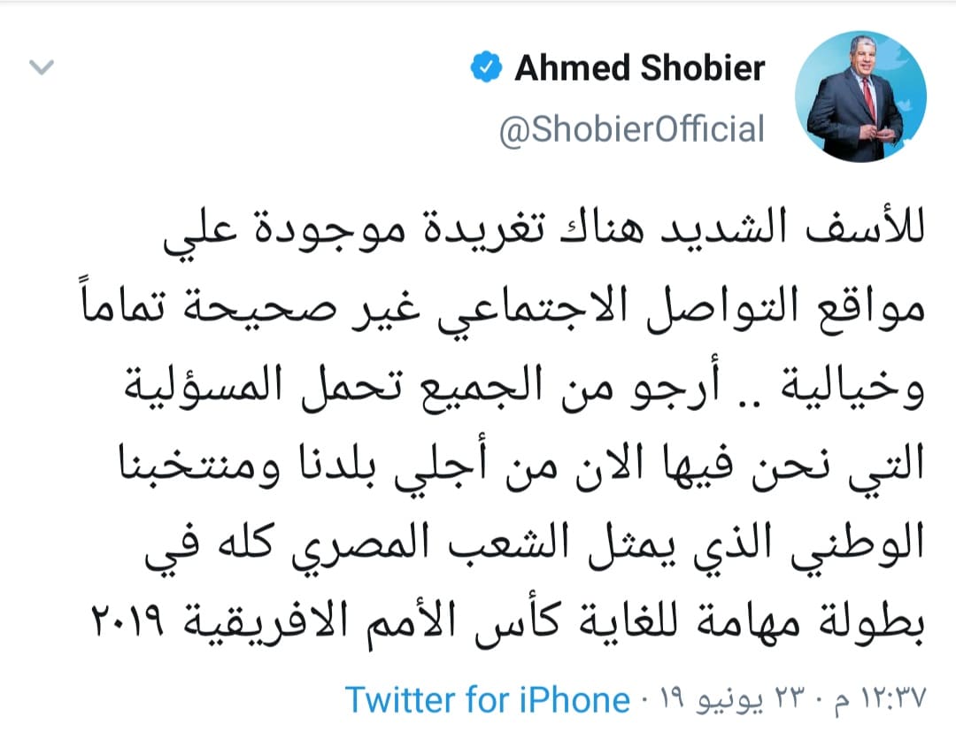 وأضاف شوبير: “أرجو من الجميع تحمل المسؤولية التي نحن فيها الآن من أجل بلدنا ومنتخبنا الوطني الذي يمثل الشعب المصري كله في بطولة مهمة للغاية -كأس الأمم الإفريقية ٢٠١٩-“.
