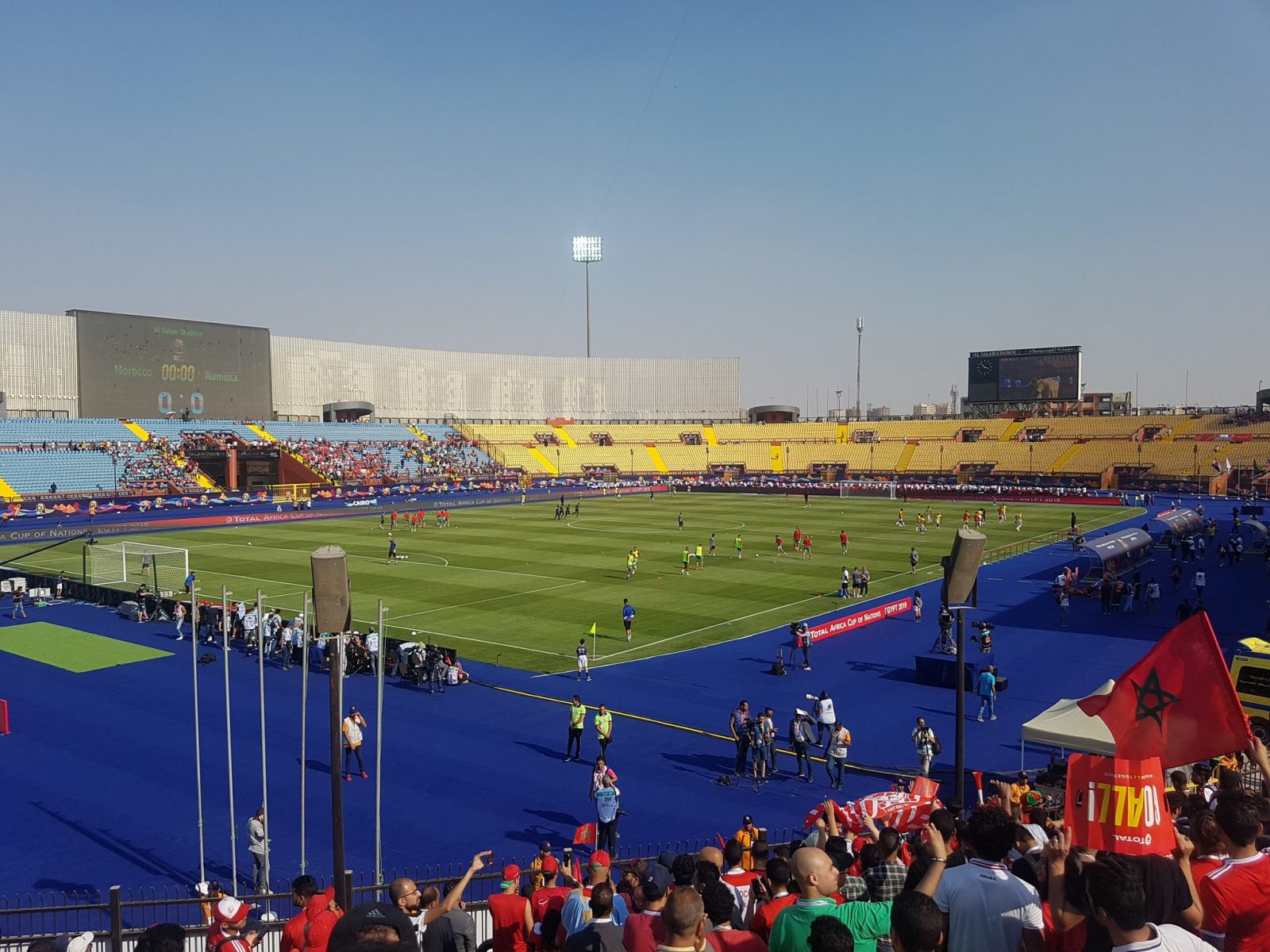 وعلى الجانب الآخر هتفت الجماهير المغربية أثناء تواجدها الآن في مدرجات ستاد السلام للنادي الأهلي وغنت” عمري ما حب غير الأهلي”.