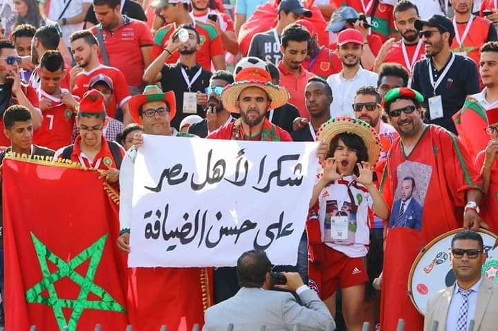 توجهت الجماهير المغربية بالشكر لأهل مصر على حسن الاستقبال والضيافة خلال هذه الفترة التي يتواجدون بها للزحف وراء فريقهم لتشجيعهم خلال بطولة كأس الأمم الإفريقية 2019، التي تستضيفها الفراعنة في الفترة من 21 يونيو حتى 19 يوليو.