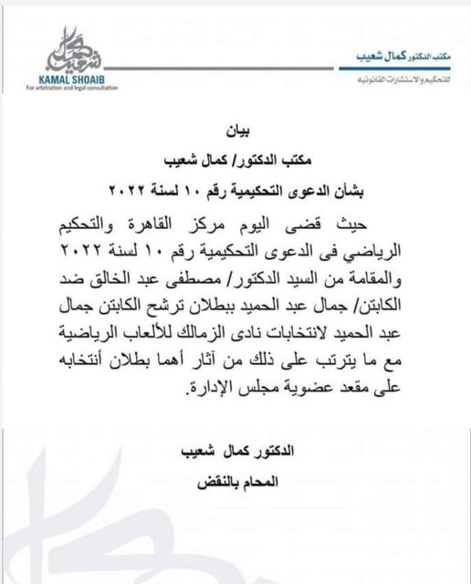 وجاء نص حكم مركز القاهرة والتحكيم الرياضي، على النحو التالي: “قضى اليوم مركز القاهرة والتحكيم الرياضي فى الدعوى التحكيمية رقم 10 لسنة 2022، والمقامة من السيد الدكتور/ مصطفى عبد الخالق ضد الكابتن/ جمال عبد الحميد ببطلان ترشح الكابتن جمال عبد الحميد الانتخابات نادى الزمالك للألعاب الرياضية مع ما يترتب على ذلك من آثار أهما بطلان انتخابه على مقعد عضوية مجلس الإدارة”.