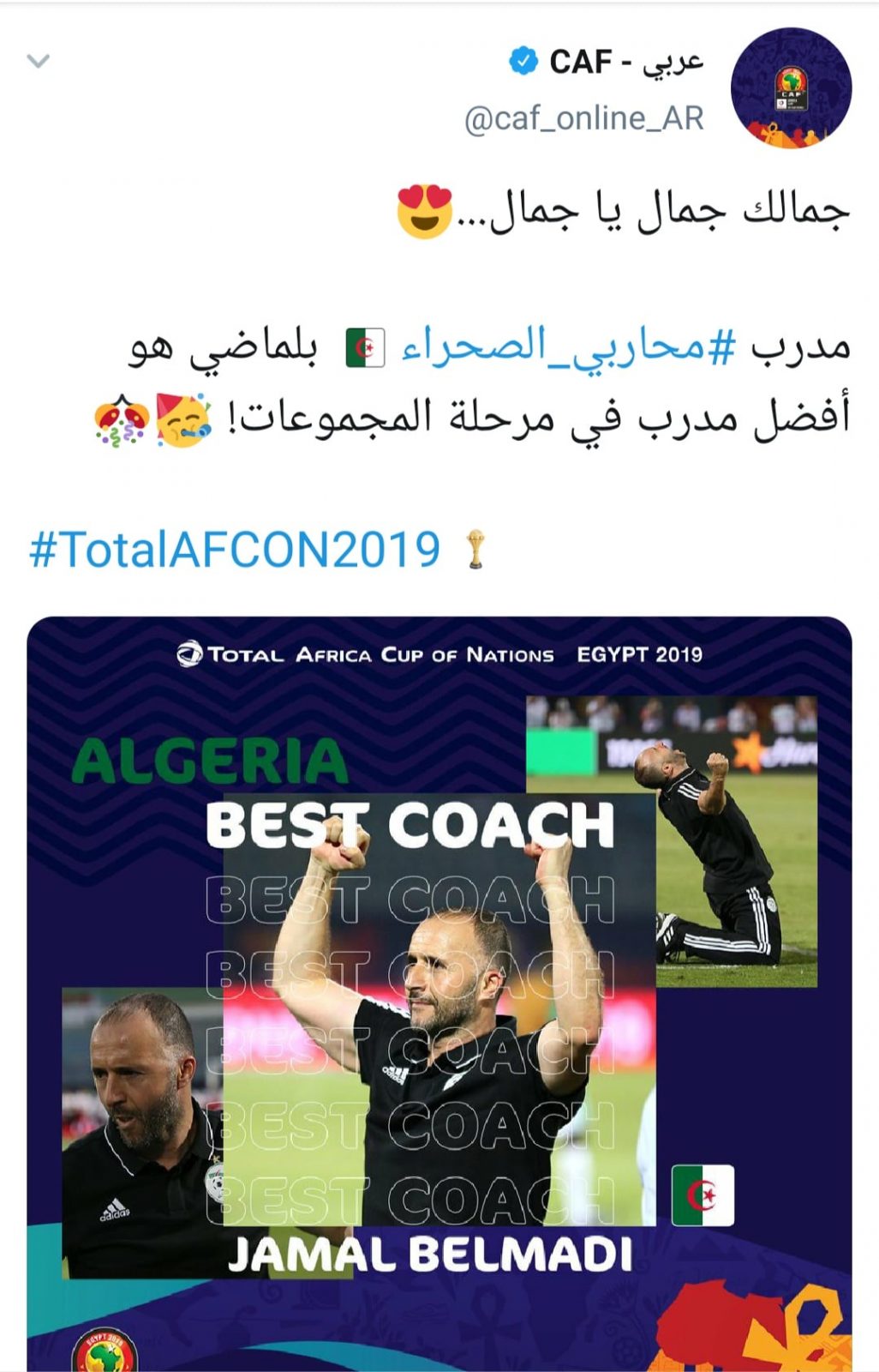 أعلنت اللجنة الفنية لبطولة كأس أمم إفريقيا 2019، في نسختها ال32 والمقامة حاليًا في مصر، عن جائزة أفصل مدير فني بدور المجموعات الذي انتهى أمس الثلاثاء.