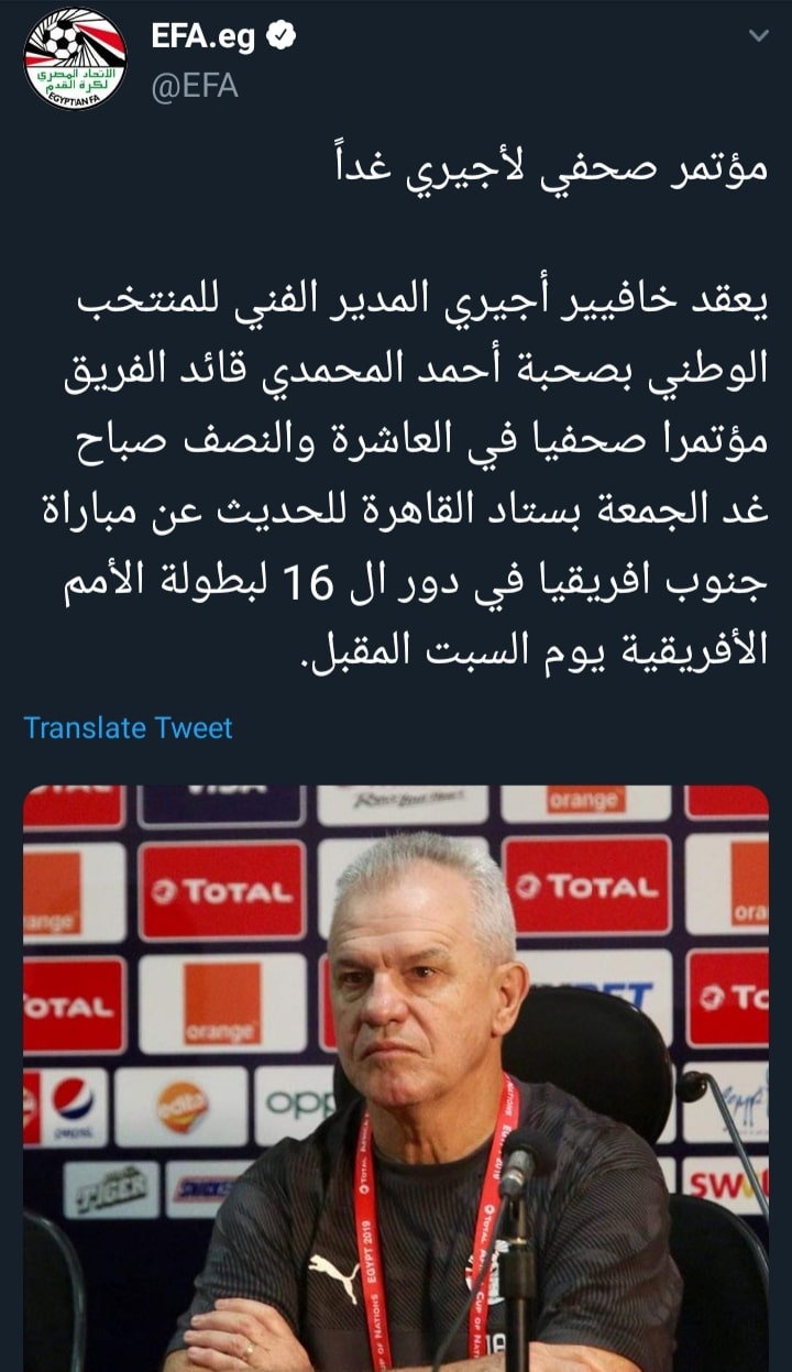 ونشر الموقع الرسمي، لمنتخبنا الوطني، عبر موقع التواصل الإجتماعي “تويتر”، تويتة تحمل موعد المؤتمر الذي يستضيفه ستاد القاهرة.