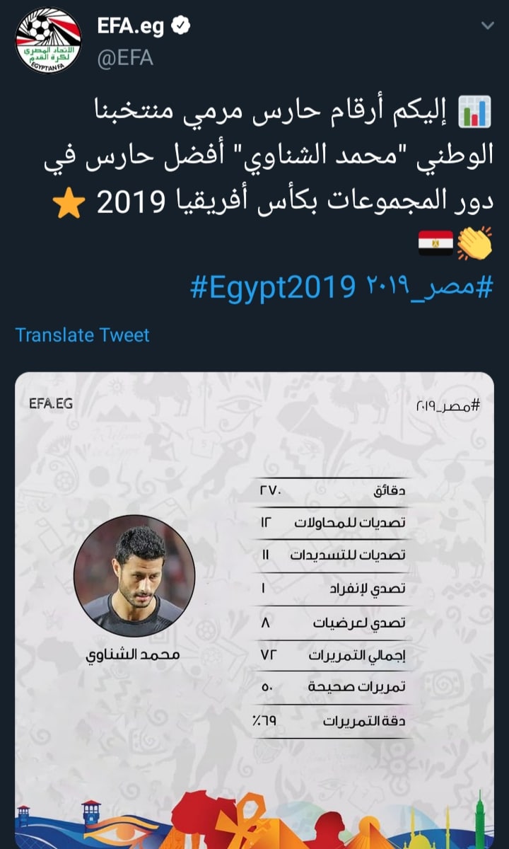 كشف الموقع الرسمي، للاتحاد المصري، عبر حسابه على مواقع التواصل الإجتماعي “تويتر”، أرقام محمد الشناوي، حارس عرين الفراعنة، خلال دور المجموعات.