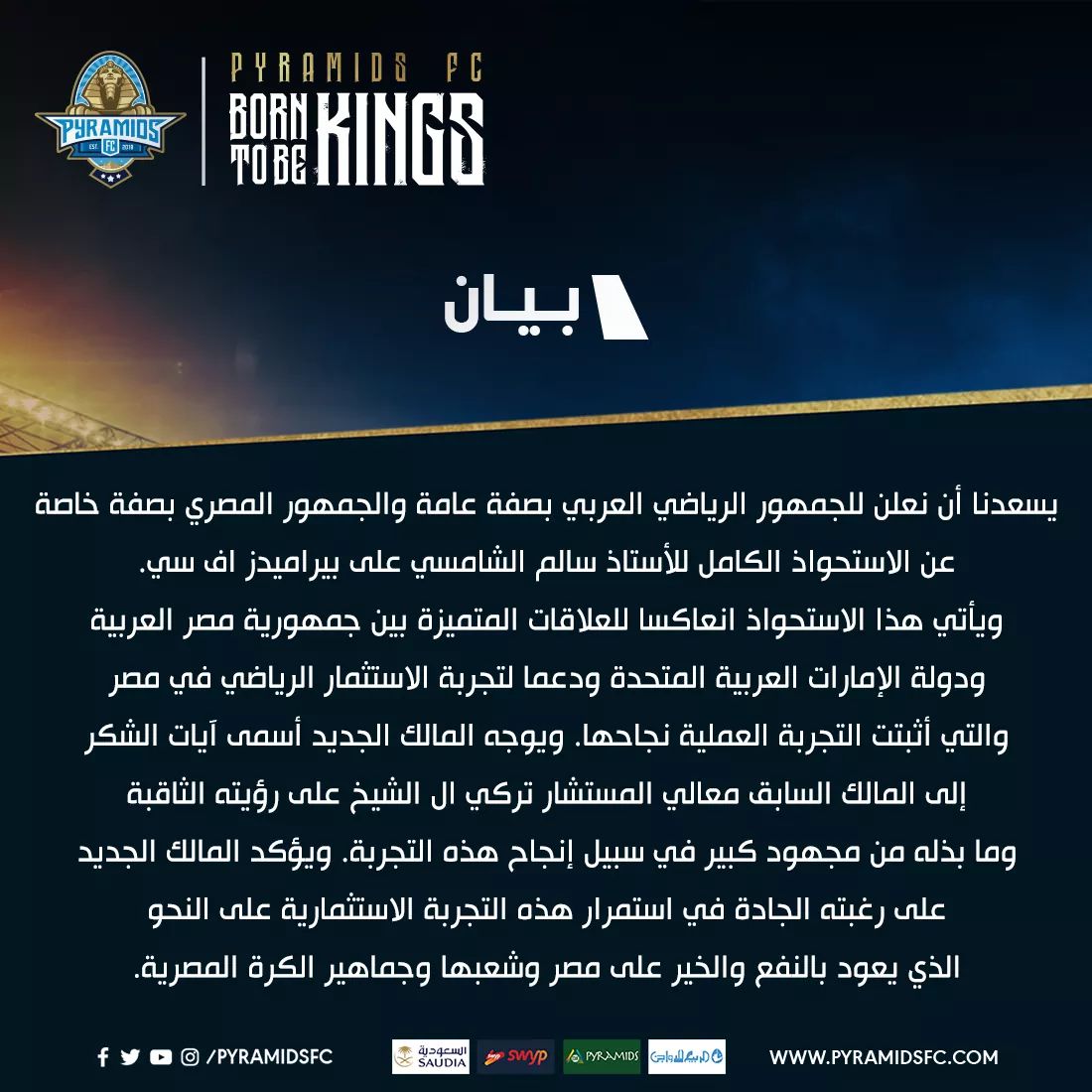 وقال البيان الذي أصدره النادي عبر موقعه الرسمي على موقع التواصل الإحتماعي فيس بوك: “يسعدنا أن نعلن للجمهور الرياضي بصفة عامة والجمهور المصري بصفة خاصة عن الاستحواذ الكامل للأستاذ سالم الشامسي على بيراميدز اف سي”.