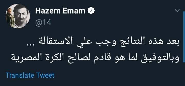 كما أعلن حازم إمام، إستقالته رسمياً، عبر موقعه الرسمي بموقع التواصل الإجتماعي “تويتر”، فكتب :” بعد هذه النتائج وجب علي الإستقلال، وبالتوفيق لما هو قادم لصالح الكرة المصرية”.