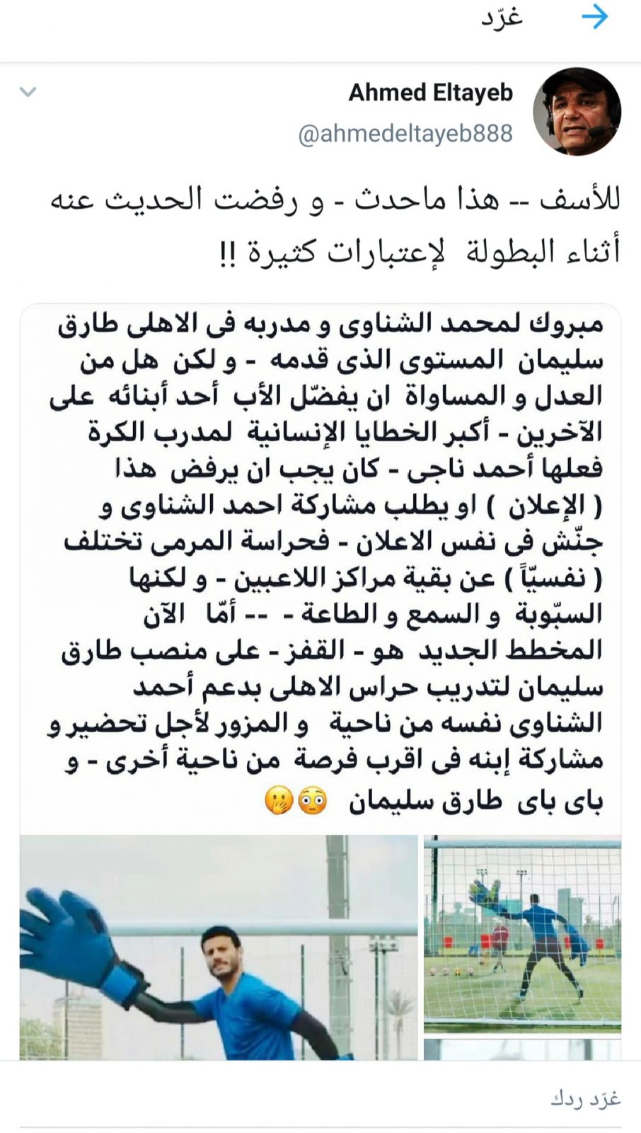 واكمل: “أما الآن المخطط الجديد هو القفز على منصب طارق سليمان لتدريب حراس الأهلي، بدعم من الشناوي من ناحية والمزور لأجل تحضير ومشاركة ابنه في أقرب فرصة من ناحية”.