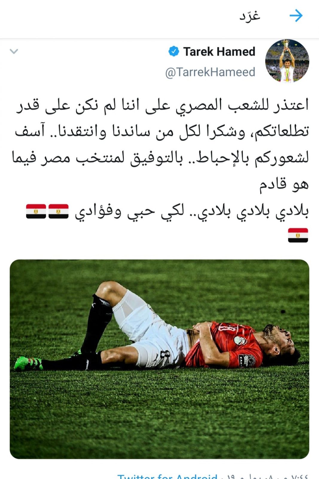 وأضاف نجم مصر: “آسف لشعوركم بالإحباط بالتوفيق لمنتخب مصر فيما هو قادم، بلادي بلادي بلادي…لكي حبي وفؤادي”.