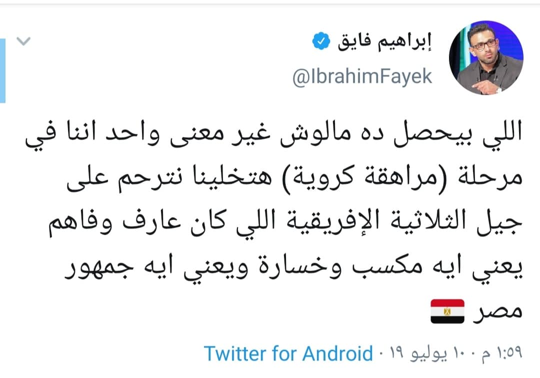 بينما كتب الإعلامي إبراهيم فايق عبر حسابه: “اللي بيحصل ده مالوش علاقة غير معنى واحد اننا في مرحلة ( مراهقة كروية) هتخلينا نترحم على جيل الثلاثية الإفريقية اللي كان هارف وفاهم يعني إيه مكسب وخسارة ويعني إيه جمهور مصر”.