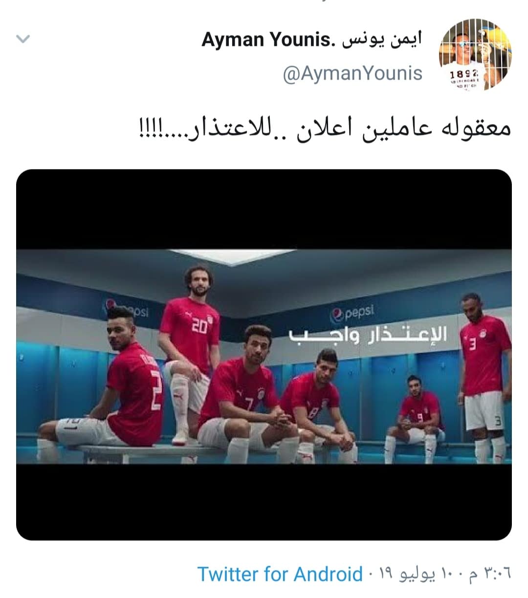 تعرض لاعبي منتخب مصر إلى حالة من الهجوم الشديد بعد ظهورهم بأحد الإعلانات لشركة بيبسي وهم يقومون بالإعتذار بعد خروجهم من بطولة الأمم الإفريقية 2019.