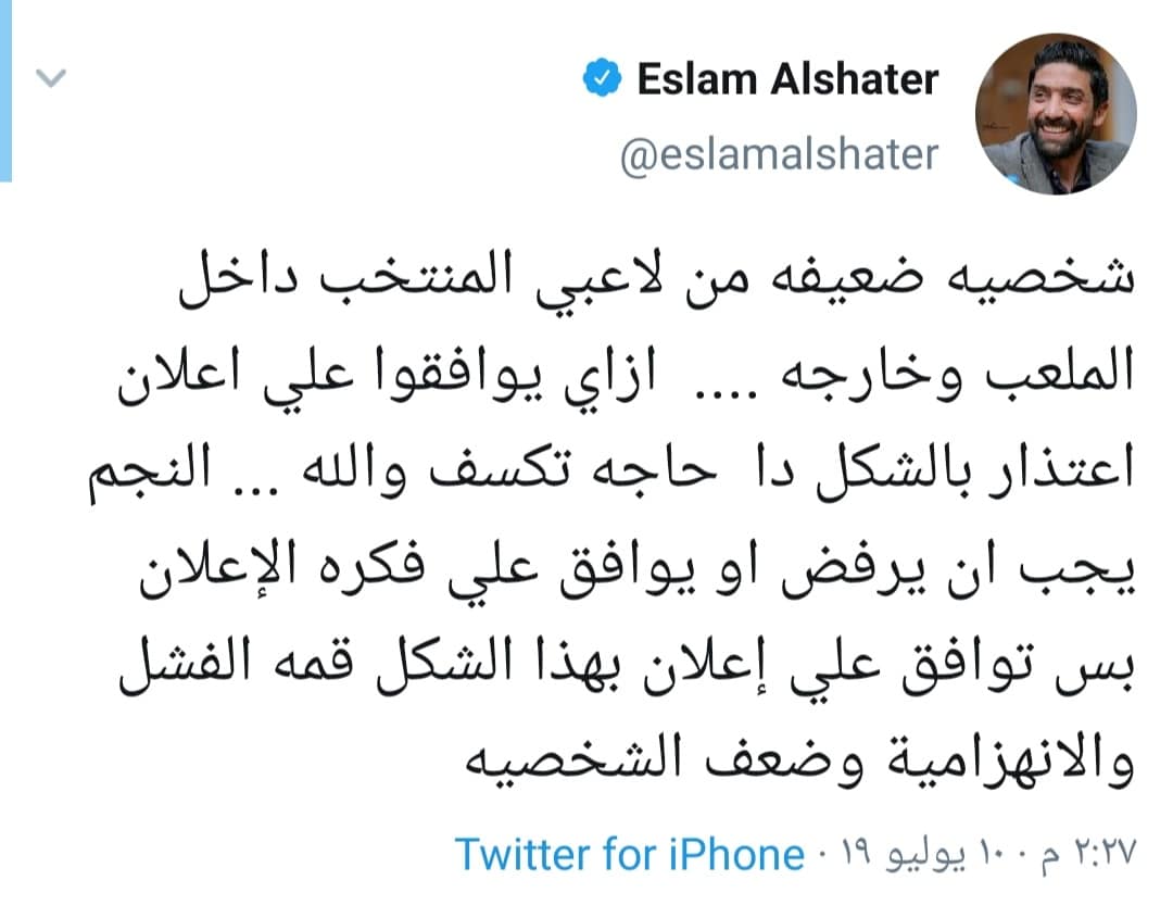 وشهد موقع التواصل الإجتماعي “تويتر” حالة من الغليان عقب ظهورهم بالإعلان وغرد إسلام الشاطر نجم مصر والأهلي السابق: “شخصية ضعيفة من لاعبي المنتخب داخل الملعب وخارجه، إزاي يوافقوا على إعلان اعتذار بالشكل دا حاجة تكسف والله”.