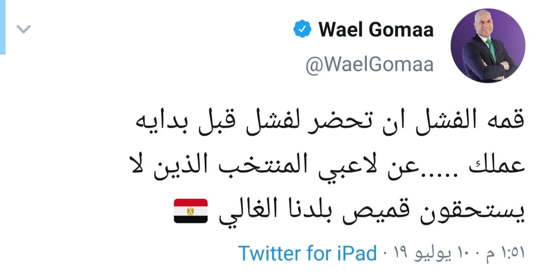 بينما أشار نجم الأهلي السابق وائل جمعة إلى تصوير الإعلان قبل بدء البطولة مغردًا: “قمة الفشل ان تحضر لفشل قبل بداية عملك….. عن لاعبي المنتخب الذين لا يستحقون قميص بلدنا الغالي”.
