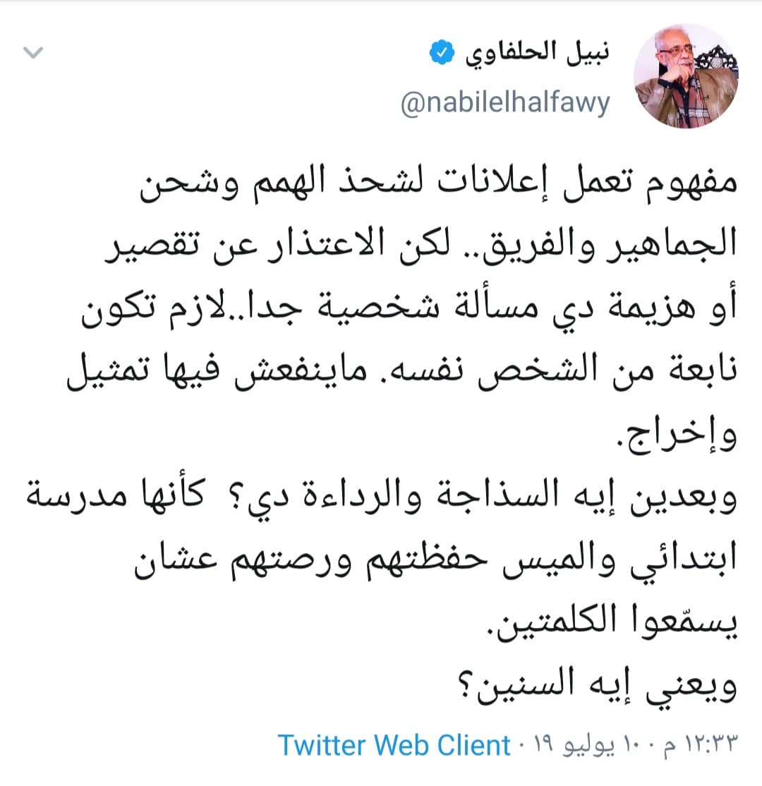 وقام الفنان نبيل الحلفاوي بالتعليق على الإعلان قائلًا: “مفهوم تعمل إعلانات لشحذ الهمم وشحن الجماهير والفريق، لكن الاعتذار عن تقصير أو هزيمة دي مسألة شخصية جدًا، لازم تكون نابعة من الشخص نفسه، وماينفعش فيها تمثيل ولا إخراج”.