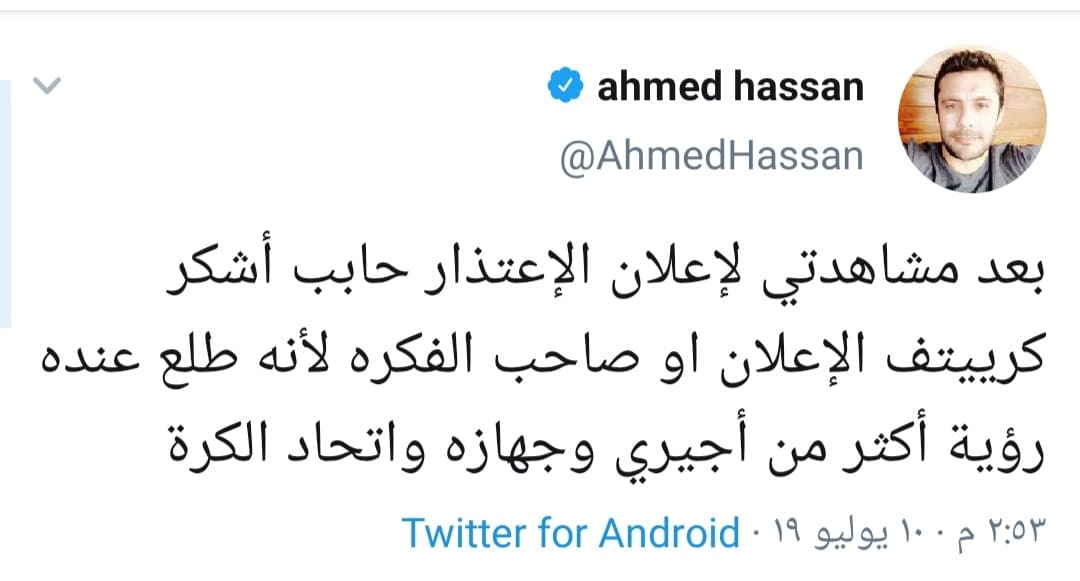 وسخر أحمد حسن نجم منتخب مصر السابق من الإعلان قائلًا: “بعد مشاهدتي لإعلان الإعتذار حابب أشكر كرييتف الآعلان أو صاحب الفكرة لأنه طلع عنده رؤية أكتر من أجيري وجهازه واتحاد الكرة”.