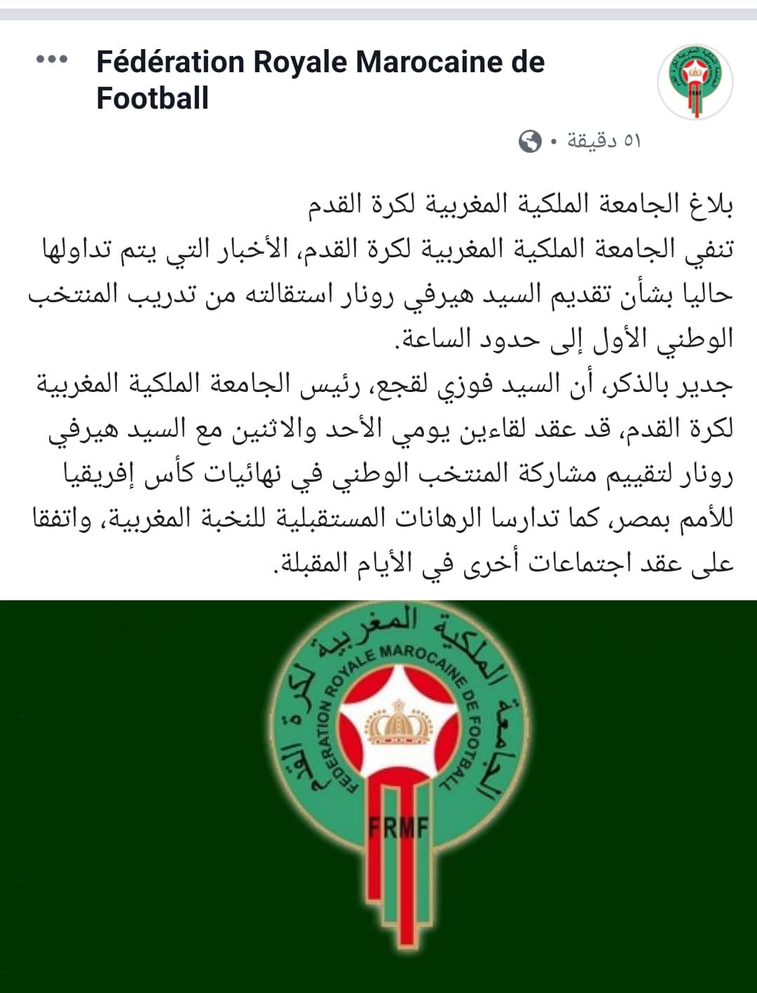 تنفي الجامعة الملكية المغربية لكرة القدم، الأخبار التي يتم تداولها حاليا بشأن تقديم هيرفي رينار استقالته من تدريب المنتخب الوطني الأول إلى حدود الساعة.