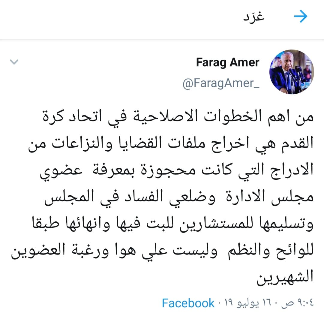 وكتب عامر على صفحته الشخصية بموقع التواصل الاجتماعي والتغريدات القصيرة “تويتر”: “من أهم الخطوات الإصلاحية في اتحاد كرة القدم هي إخراج ملفات القضايا والنزاعات من الأدراج التي كانت محجوزة”.