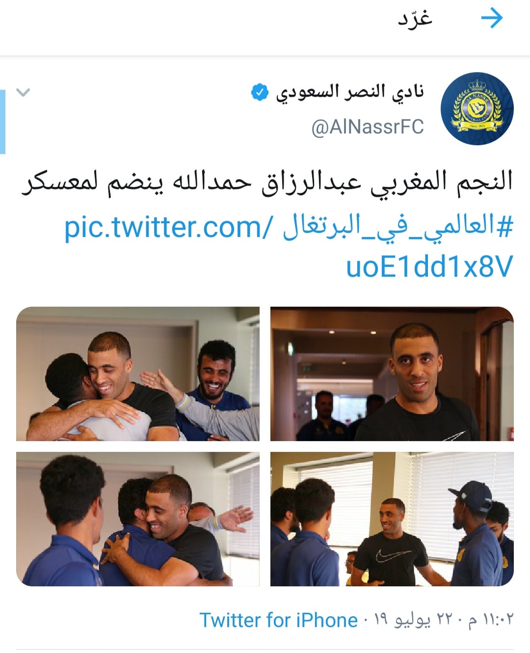 ونشر النادي عبر صفحته الرسمية على موقع التواصل الاجتماعي “تويتر” صورًا للترحيب باللاعب وكتب عليها: “النجم المغربي عبد الرزاق حمد لله ينضم لمعسكر العالمي في البرتغال”.