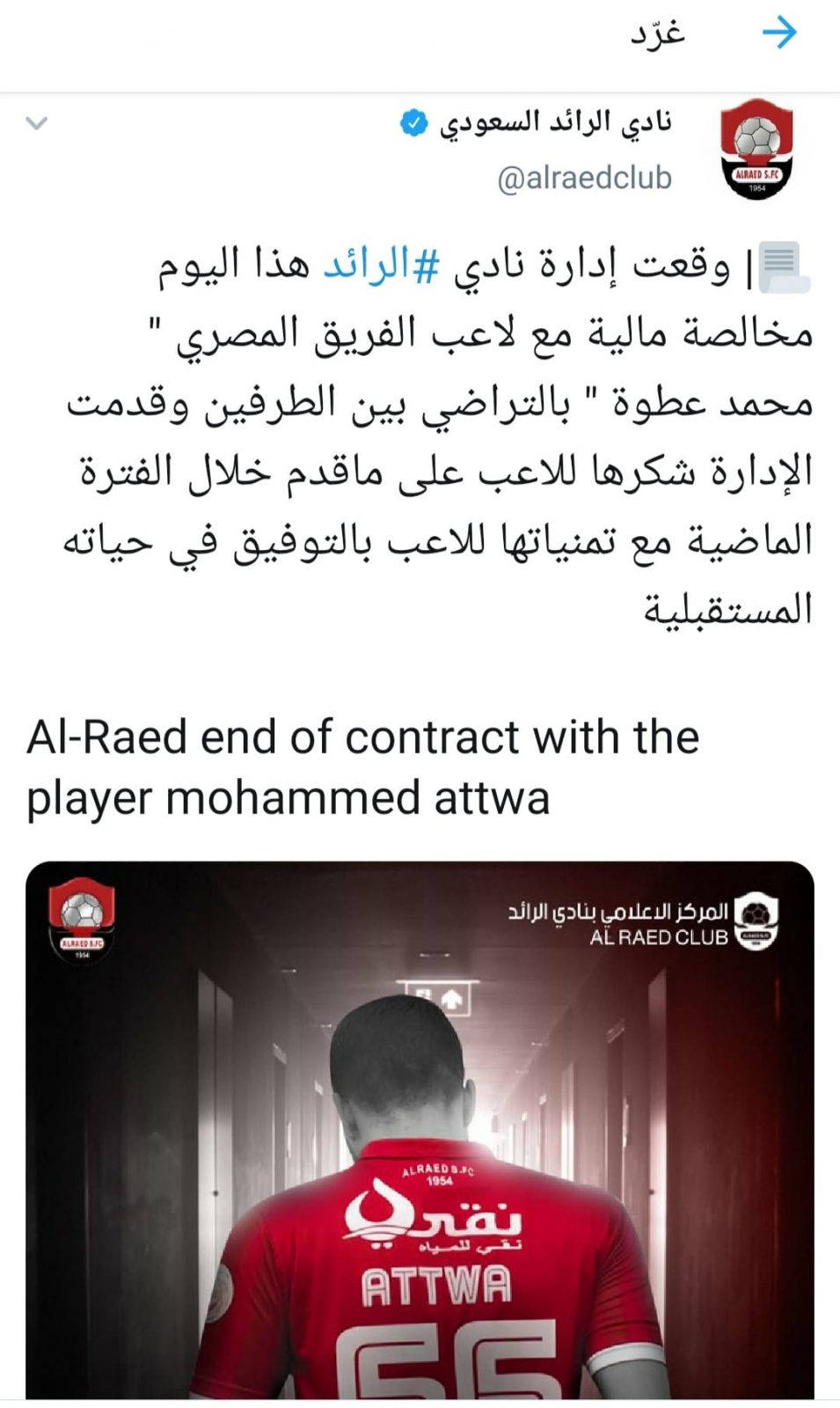 وفي تغريدة أخرى كتب: “وقعت إدارة نادي الرائد هذا اليوم مخالصة مالية مع لاعب الفريق المصري ” محمد عطوة ” بالتراضي بين الطرفين وقدمت الإدارة شكرها للاعب على ماقدم خلال الفترة الماضية مع تمنياتها للاعب بالتوفيق في حياته المستقبلية”.